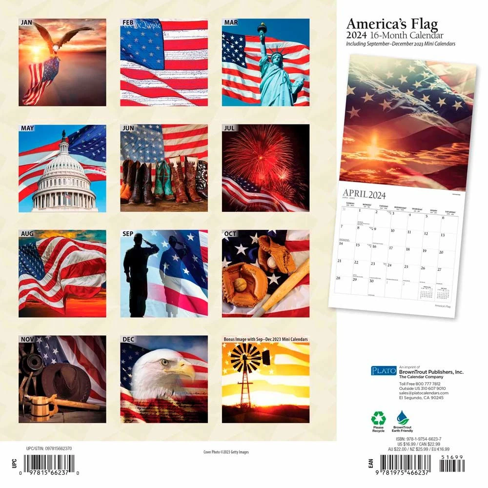 The American flag has changed 26 times since it was first adopted after the Revolutionary War. Adopted by resolution from the Continental Congress on June 14, 1777 (Flag Day), the American flag was originally designed with thirteen stars in a circle on a blue field with thirteen stripes alternating red and white. The thirteen stripes remain, representing the original thirteen colonies of the United States. The flag is also a symbol of ideology: a reminder that it waves in the land of the free and the home of the brave. This calendar features the American flag waving proudly from Wall Street to Main Street, all across the USA.