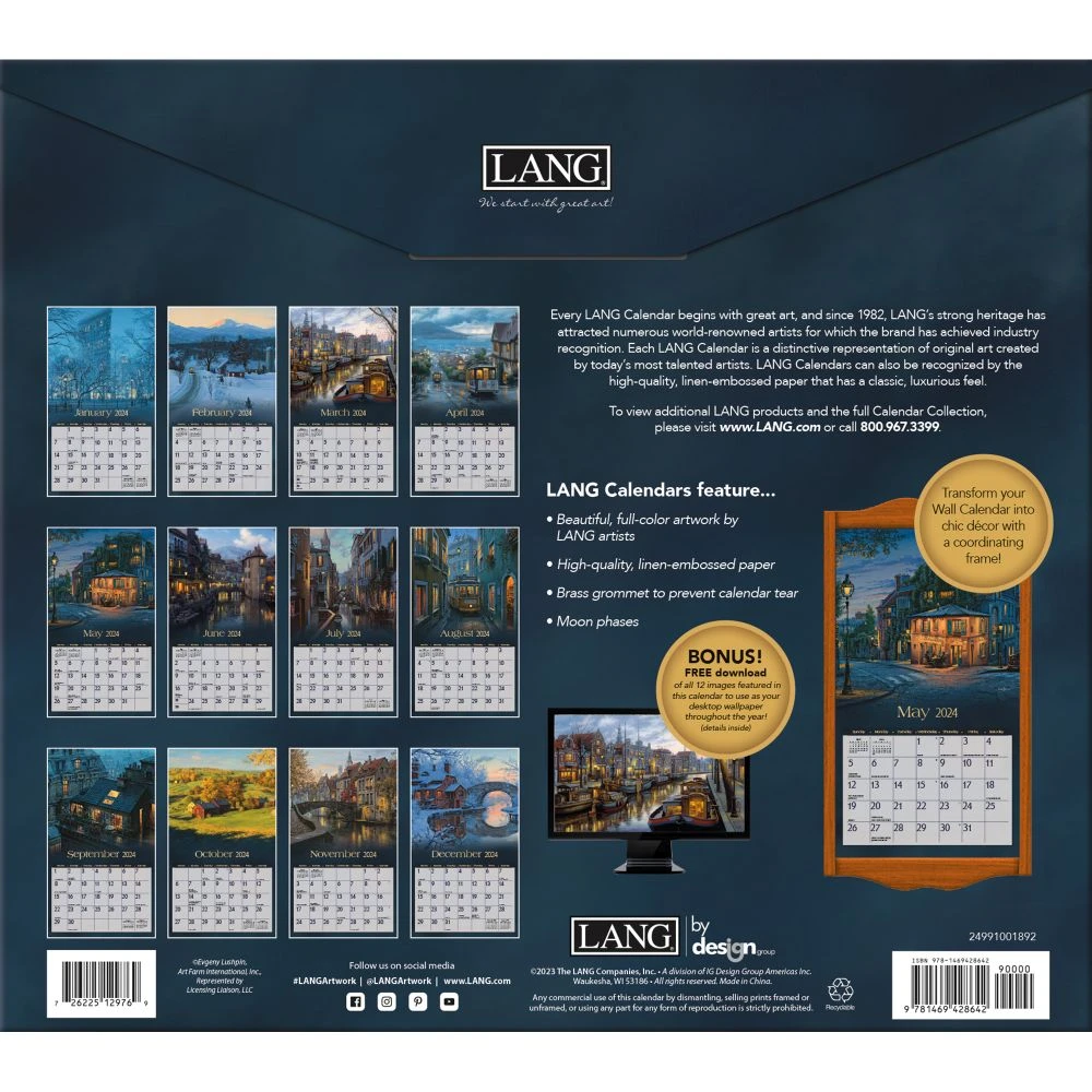 The Around the World 2024 Wall Calendar features artwork by Evgeny Lushpin of picturesque locales in famous cities around the world every month. LANG Wall Calendars feature monthly full color images, elegant linen embossed paper stock, and a brass grommet for hanging. Desktop wallpaper download available.