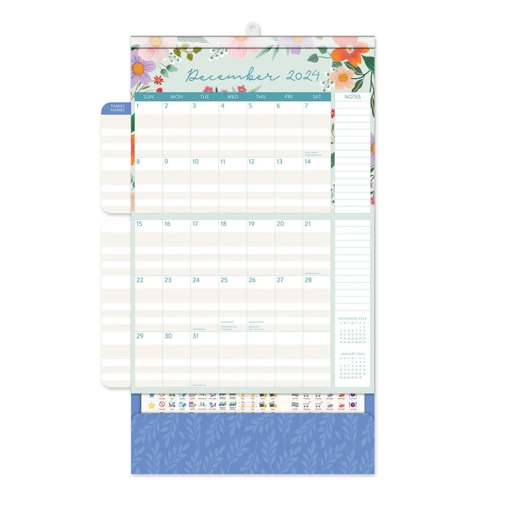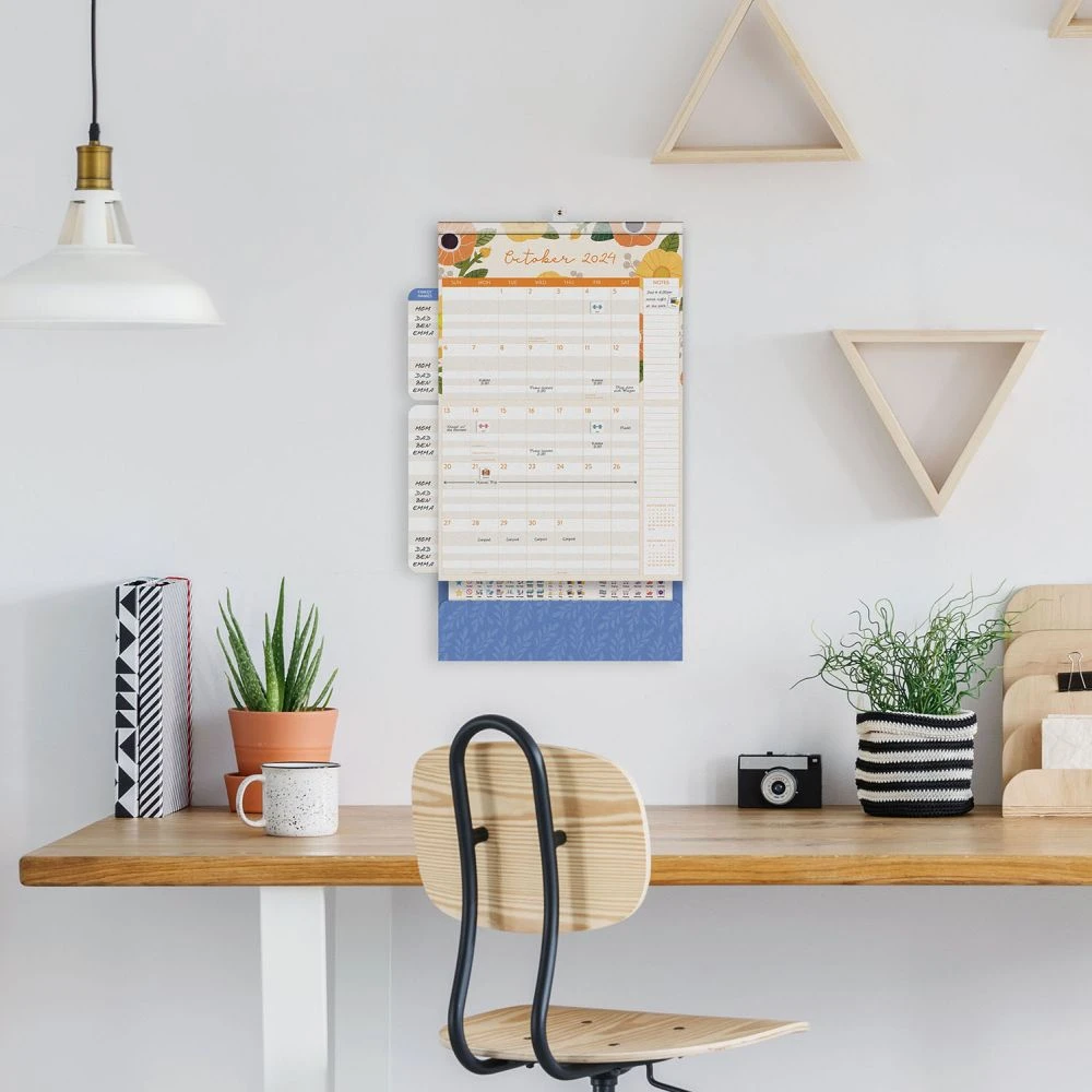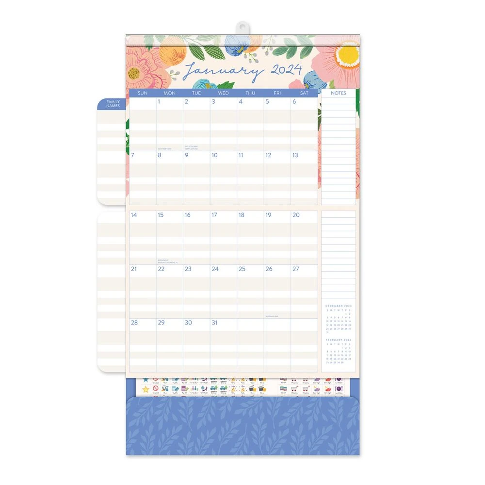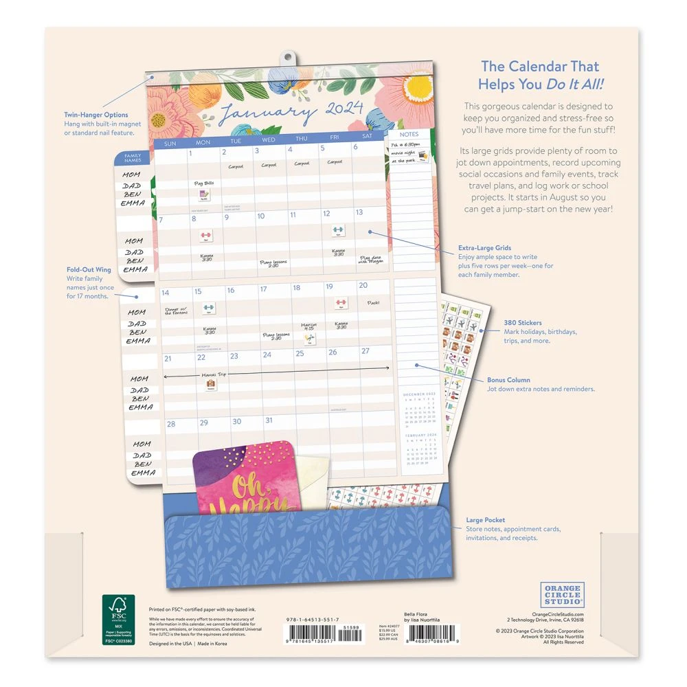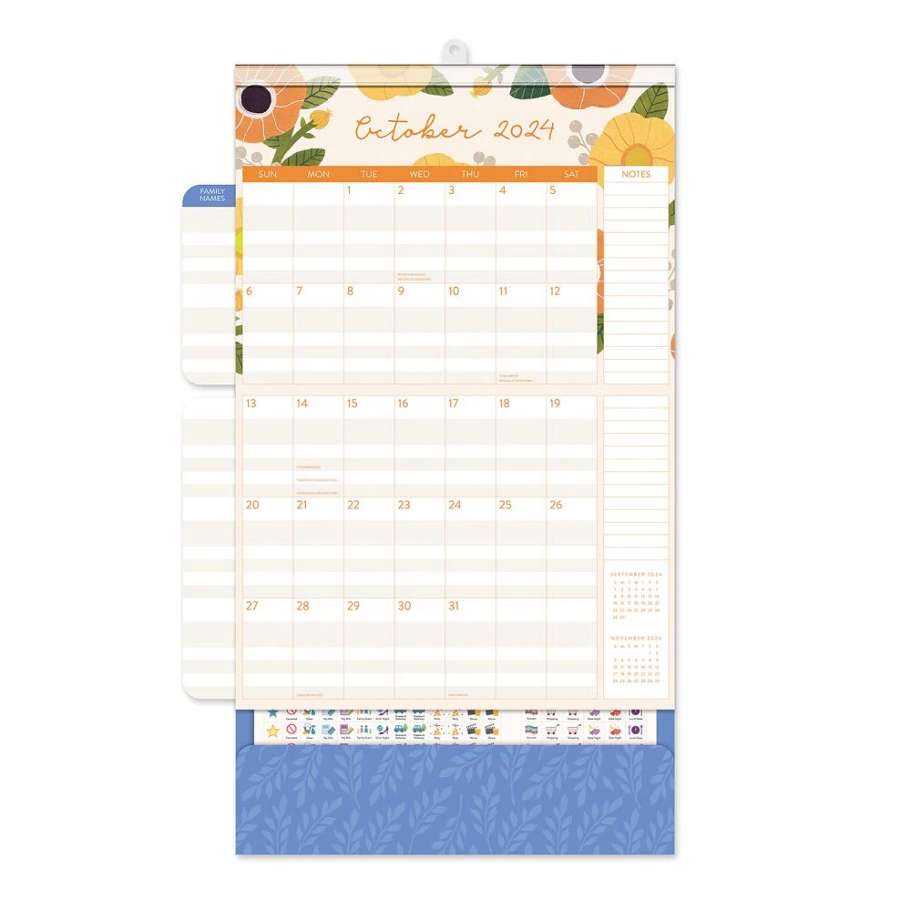 Manage even the busiest schedule with the easy to use Do It All Calendar from Orange Circle Studio. The large grid provides plenty of space to jot down appointments and reminders. Write up to five family members’ names on the fold out wings to keep track of everyone’s important events throughout the year, and store receipts, tickets, and more in its handy pocket. Use the more than 300 stickers to mark holidays, appointments, and other important dates. With a strong magnetic hanger, you can mount this calendar on any magnetic surface or use the traditional nail hanger. Unique illustrations and designs adorn every page, with the artist benefiting directly from each calendar purchased, further supporting creativity communities around the globe.