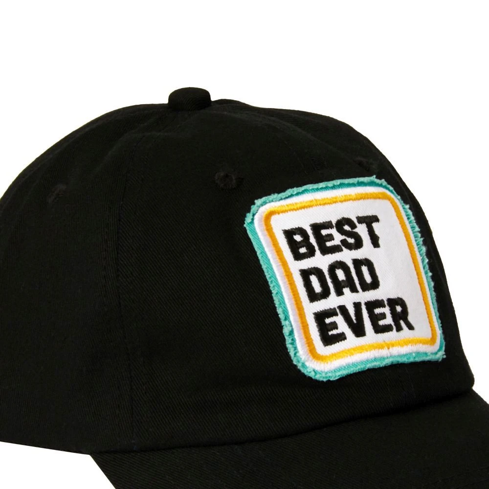 Black distressed cotton twill ball cap featured colorful embroidered patch detailing on the front. Best Dad Patch. Adjustable