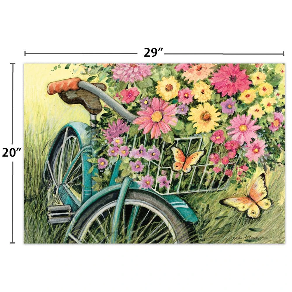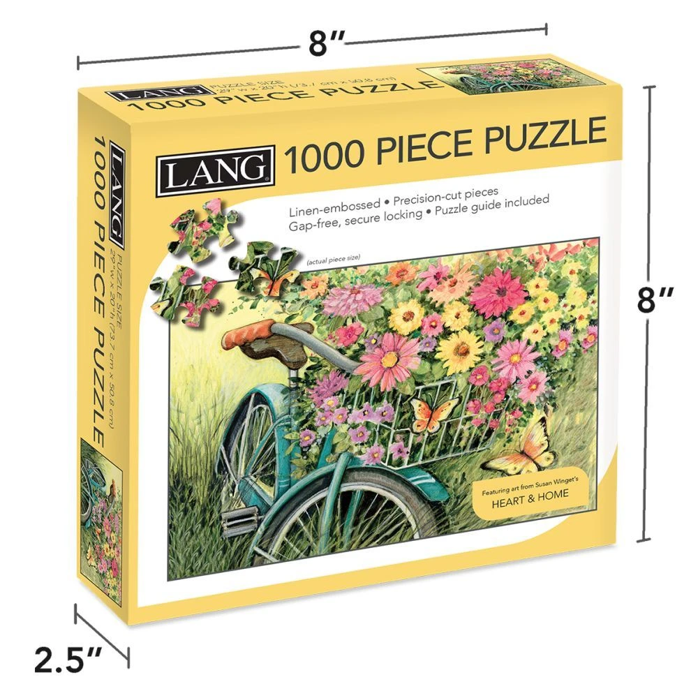 LANG jigsaw puzzles are a fun, yet challenging activity to do with friends and family. Assemble the Bicycle Bouquet 1000 Piece Puzzle to form a painting by Susan Winget of a bicycle with flowers in its basket. All pieces, finished with elegant linen embossed paper, securely lock in place and come in a resealable plastic bag. An art print guide is also included to help you solve this challenging puzzle!