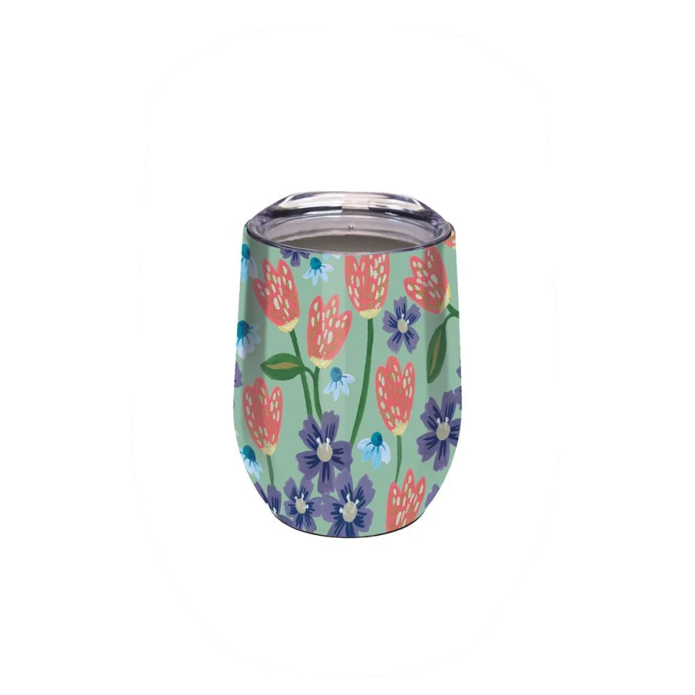 The 12 oz. Planted Stainless Steel Wine Tumbler features a colorful design by Eliza Todd and is vacuum insulated, perfect for either hot or cold liquids.