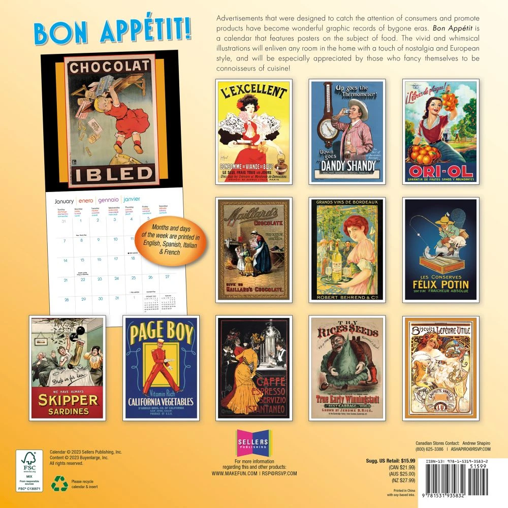 Bon Appétit is a wall calendar that features posters on the subject of food. Advertisements that were designed to catch the attention of consumers and promote products have become wonderful graphic records of bygone eras. The vivid and whimsical illustrations will enliven any room in the home with a touch of nostalgia and European style, and will be especially appreciated by those who fancy themselves to be connoisseurs of cuisine!