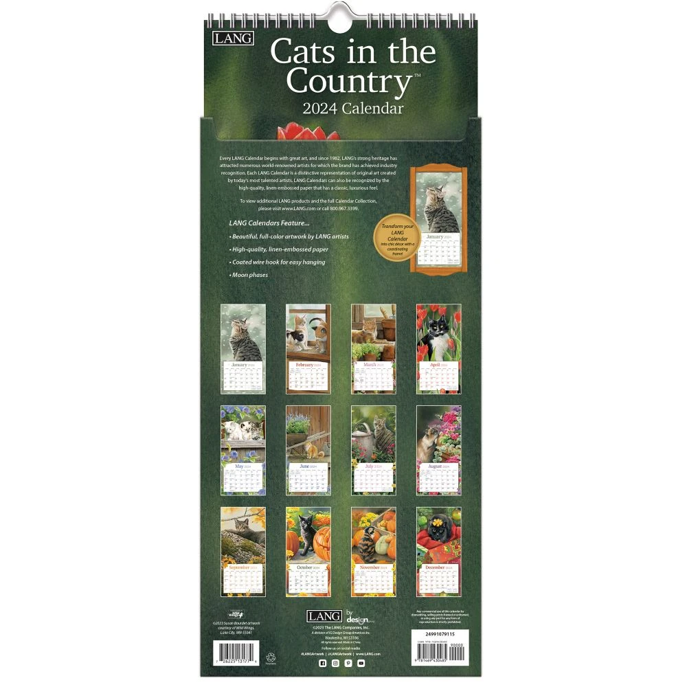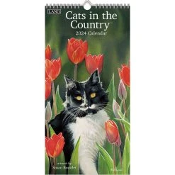 The Cats in the Country 2024 Vertical Wall Calendar features monthly artwork of playful cats by Susan Bourdet in a space efficient vertical format. LANG Vertical Wall Calendars feature linen embossed paper stock, a spiral binding with hook for hanging, and matching gift jacket.