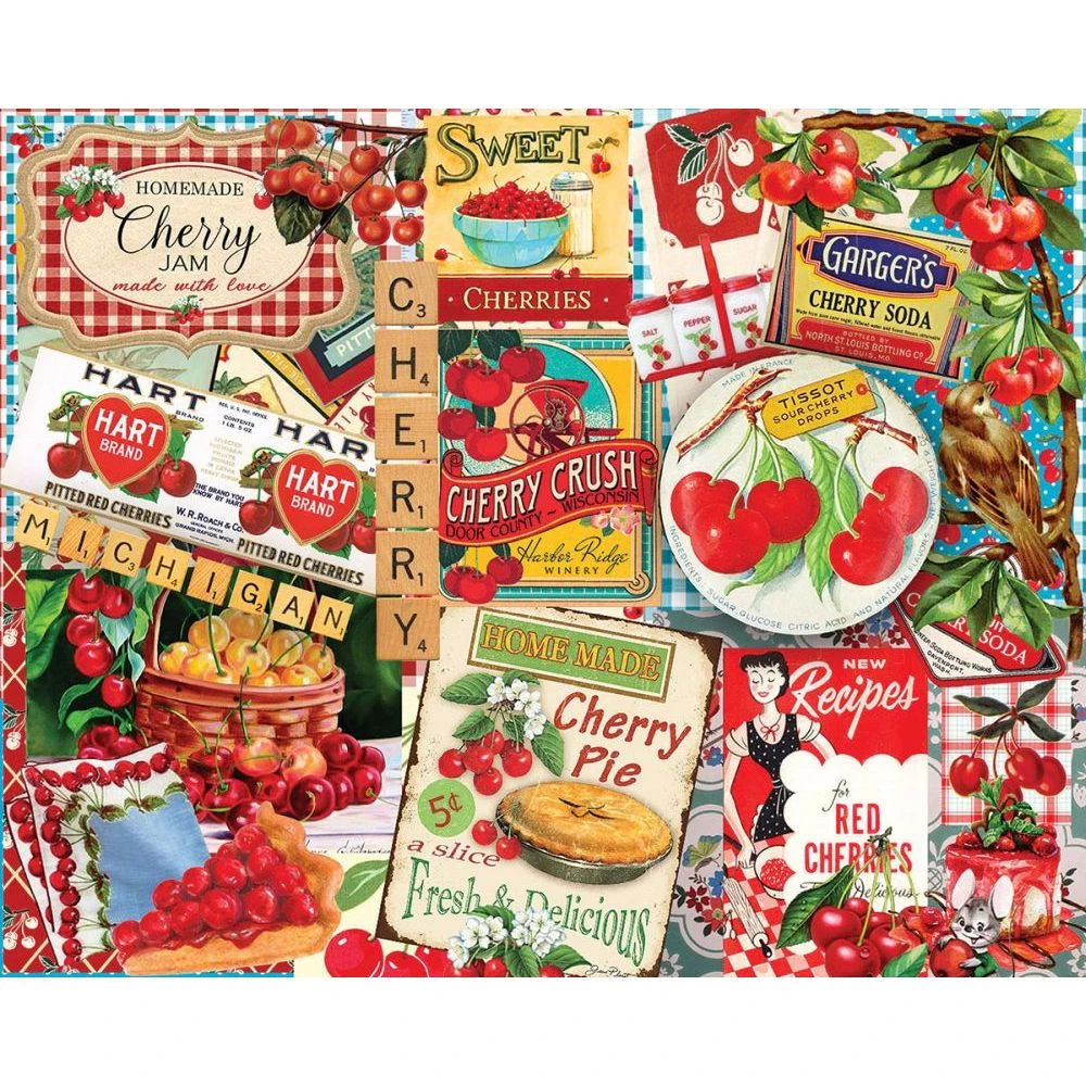 Cherries 1000 Piece Puzzle This 1000 piece jigsaw puzzle contains thick interlocking pieces made from recycled premium blue chipboard that give a sturdy feel & easy grip. Made in USA. Finished size 24?x30?.