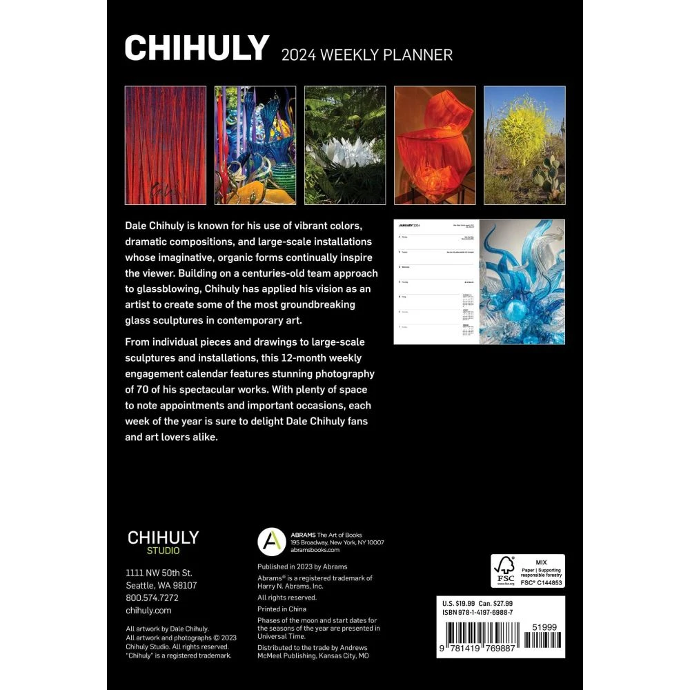 Note important occasions and appointments with this softcover, 52-week engagement calendar featuring 70 luminous works by internationally renowned artist Dale Chihuly.