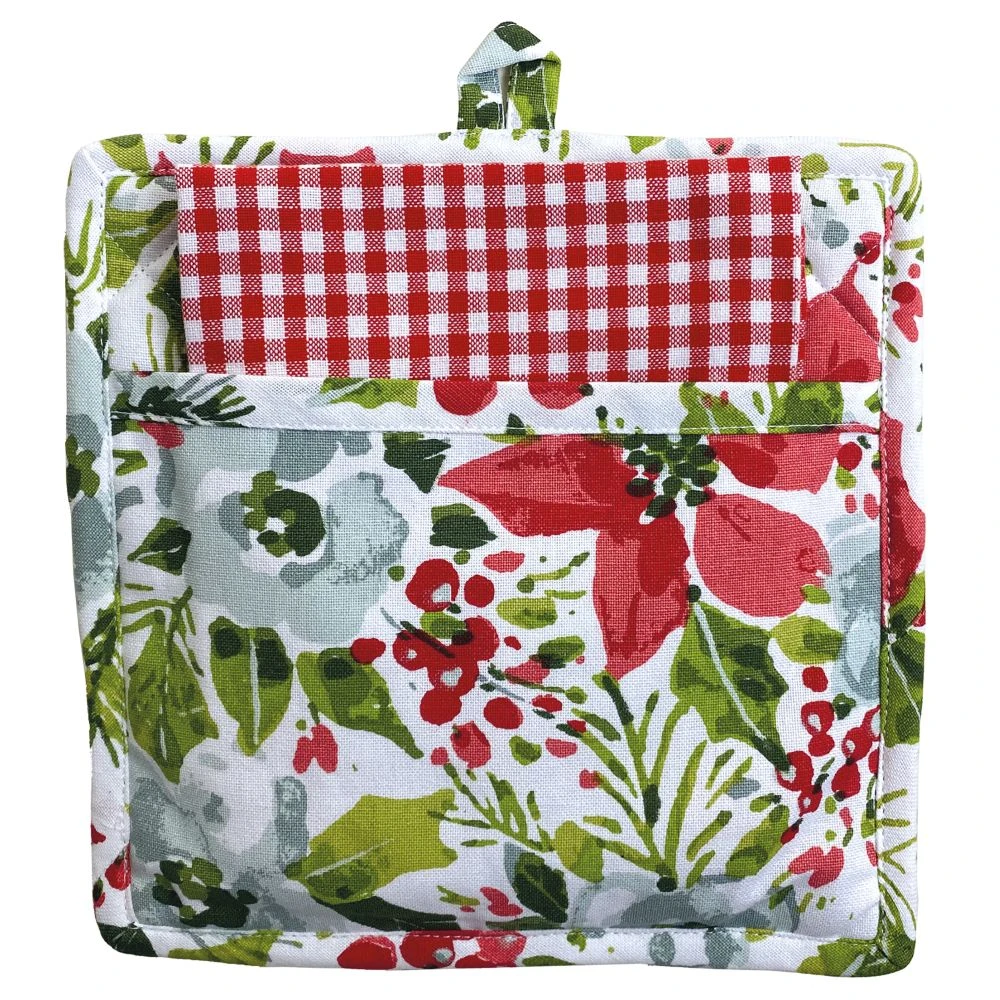 Turn your kitchen into a jolly poinsetta-filled cooking paradise with the Christmas Forever Potholder and Dishtowel Set. The colorful potholder has a quilted back for heat resistance and sewn in loop for hanging. Size is 9″W X 9″H. The matching woven dishtowel measures 18″W X 28″ H. Both items are made with 100% cotton and have sewn-in loops for hanging. Artwork by Lisa Audit.