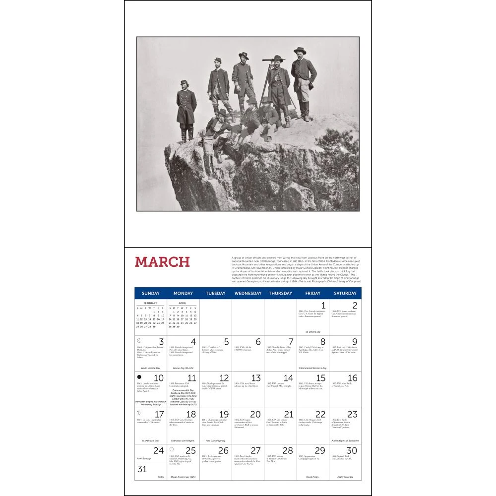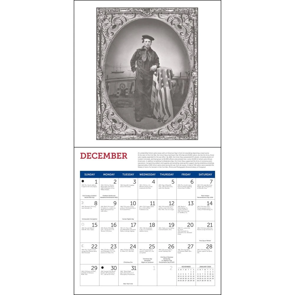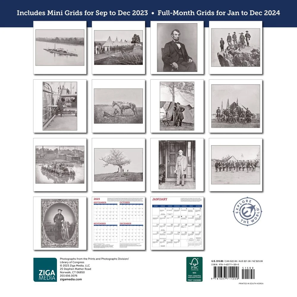A daily chronology of major events of the Civil War are accompanied by vintage photographs by such renowned photo artists as Mathew Brady in this informative 2024 calendar. Captions provide historical background for each image, and quotations of first hand accounts reveal how the soldiers, officers, and families experienced the terrible conflict that split America apart.