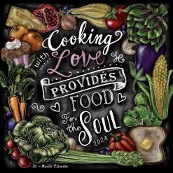The Cooking With Love 20024 Wall Calendar provides Food for the Soul. This calendar features the gorgeous, hand drawn chalkboard designs of Pam Vale and will inspire you to create your own recipe for a happy life. Weve chosen the most popular of Pams chalk art recipes, like lobster bisque and Hawaiian meatballs, to brighten your home with a bit of modern nostalgia.