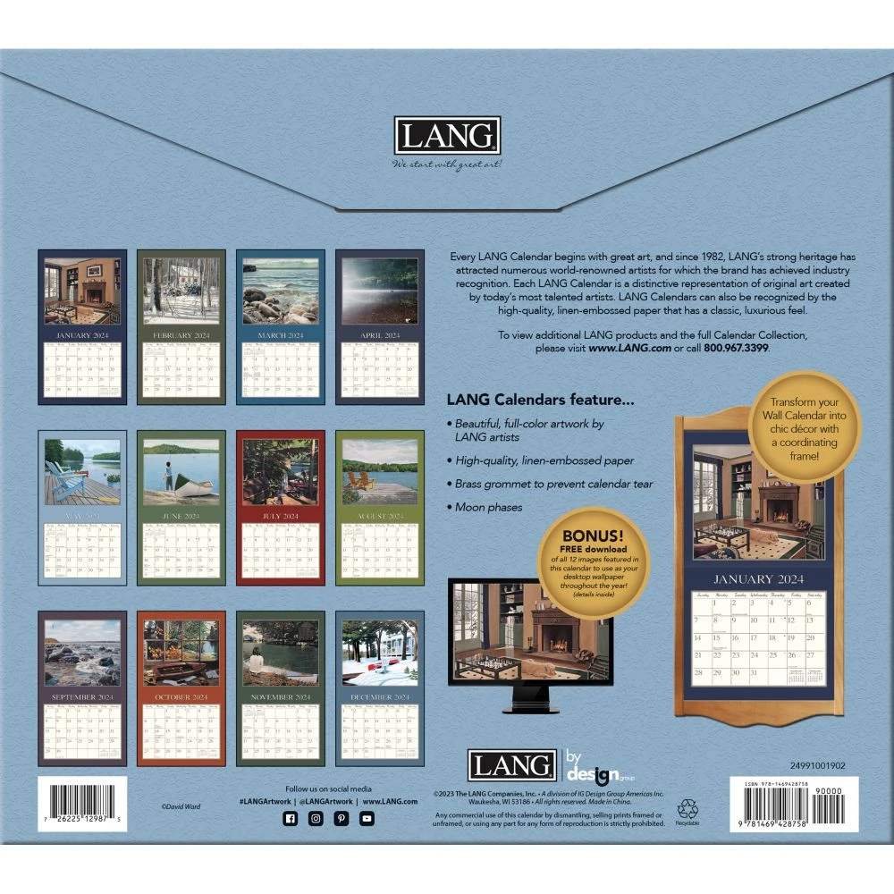 The Cottage Country 2024 Wall Calendar features artwork by David Ward of lakeside cottages and tranquil woodlands every month. LANG Wall Calendars feature monthly full color images, elegant linen embossed paper stock, and a brass grommet for hanging. Desktop wallpaper download available.
