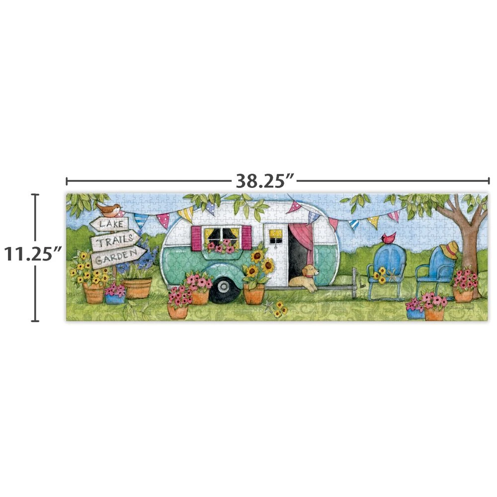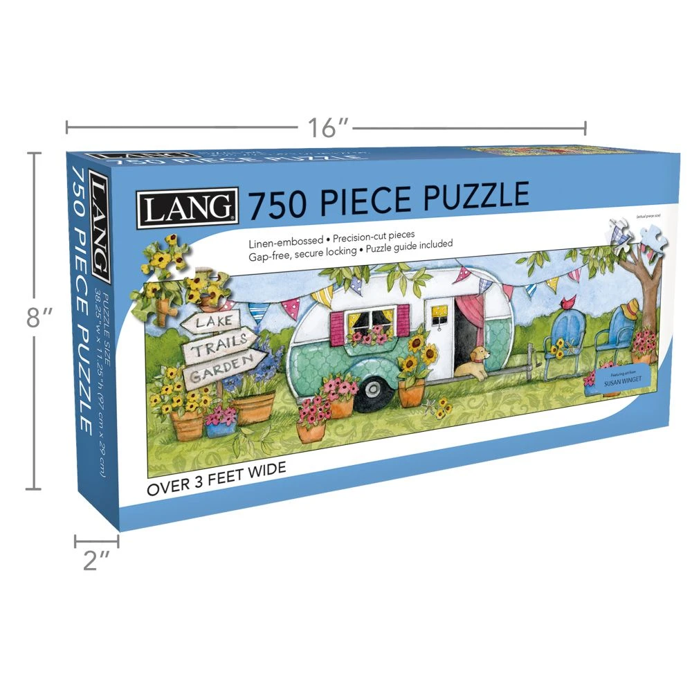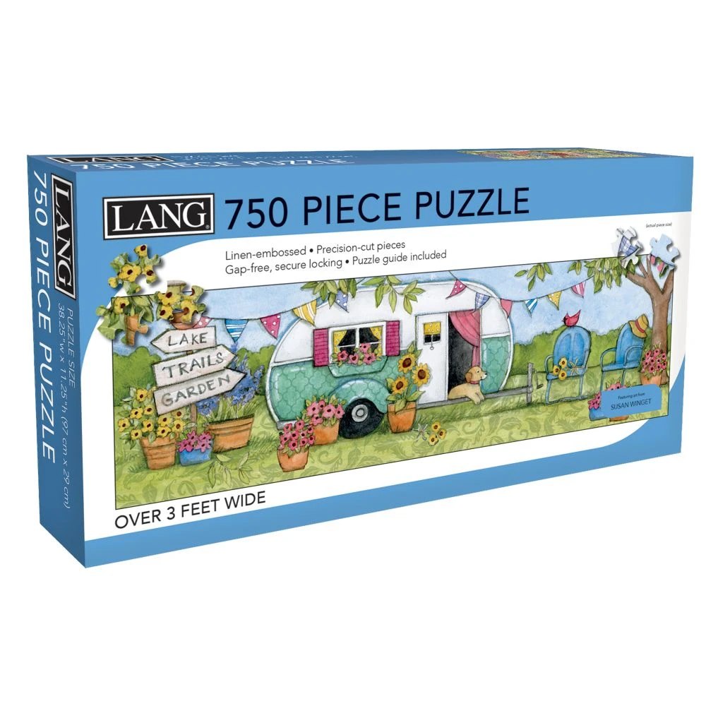 LANG jigsaw puzzles are a fun and challenging activity to do with friends and family! Tackle the panoramic Country Camper 750-Piece Puzzle, featuring artwork by Susan Winget. Each puzzle piece is finished with linen-embossed paper so the completed piece looks like one large canvas! If you get stumped, an art guide print is included to help you out.