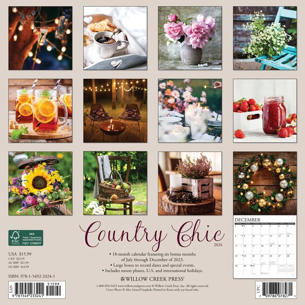 Do you love reclaimed barnwood, wildflowers, farm fresh eggs and mason jars? Country Chic is a calendar of simple beauty, homespun d?cor and an idyllic rural lifestyle that values all that is best in life. Printed with soy based inks on FSC certified paper, this 12″ x 24″ wall calendar features large monthly grids that offer ample room for jotting notes, along with six bonus months of July through December of 2023. Also includes moon phases (CST), standard U.S. and international holidays.