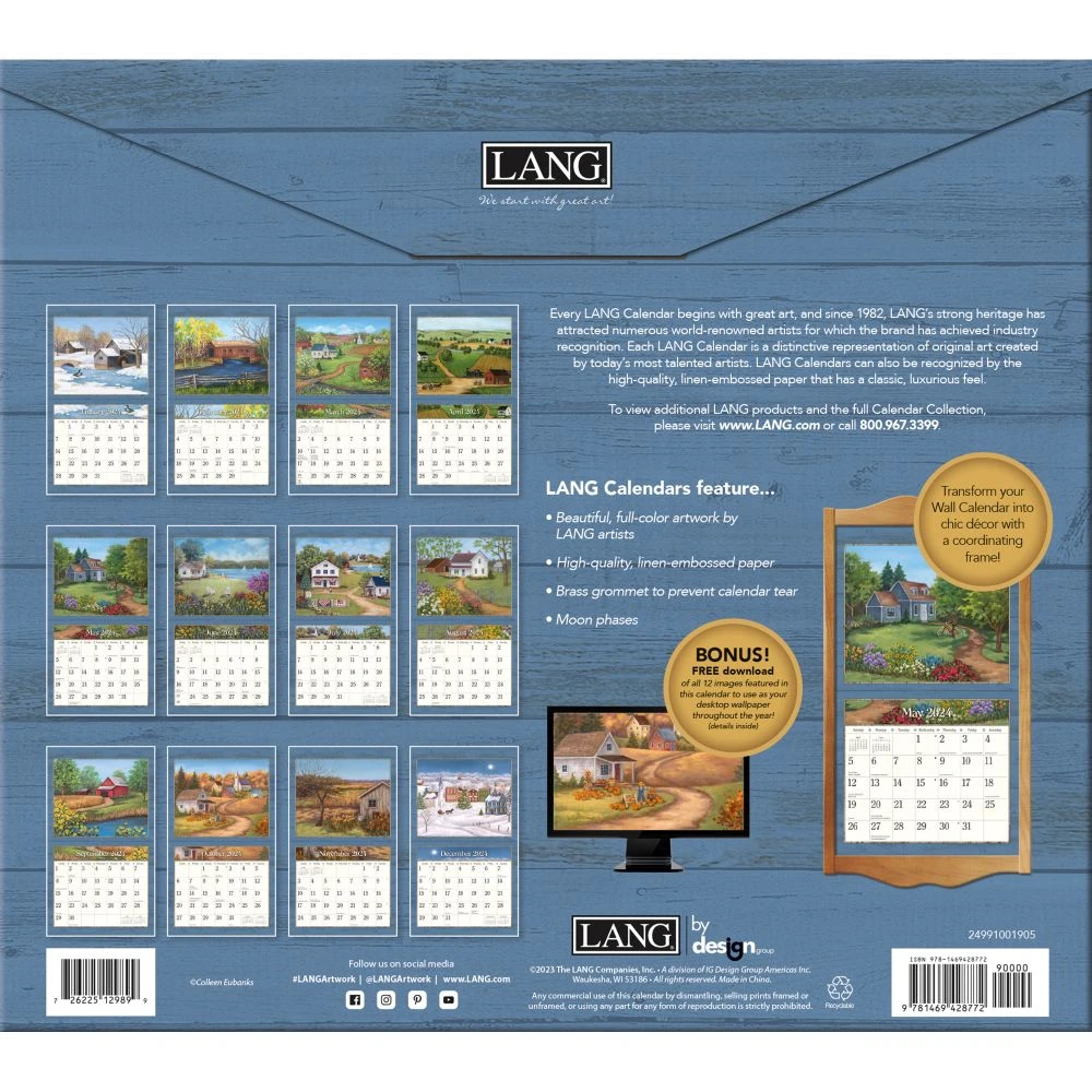 The Country Living 2024 Wall Calendar features monthly artwork by Colleen Eubanks of beautiful rural landscapes and communities. LANG Wall Calendars feature monthly full color images, elegant linen embossed paper stock, and a brass grommet for hanging. Desktop wallpaper download available.