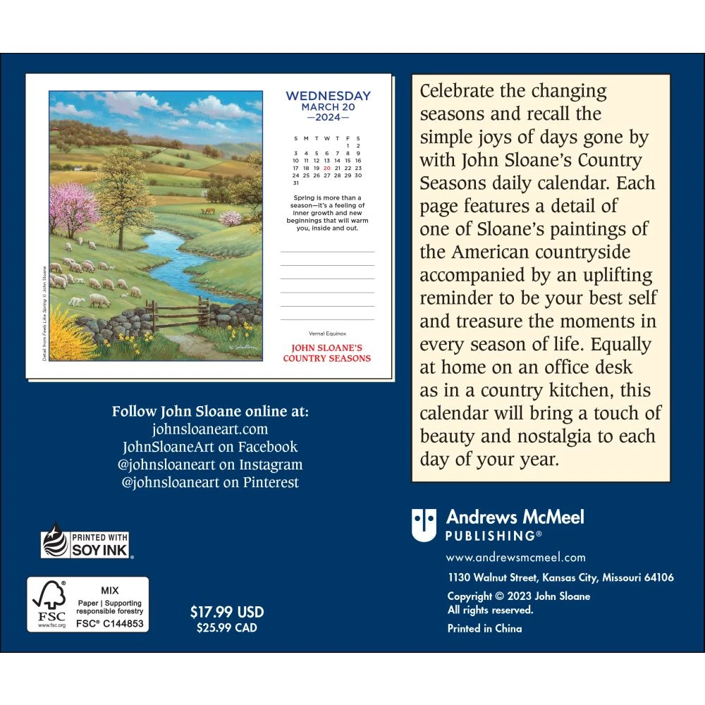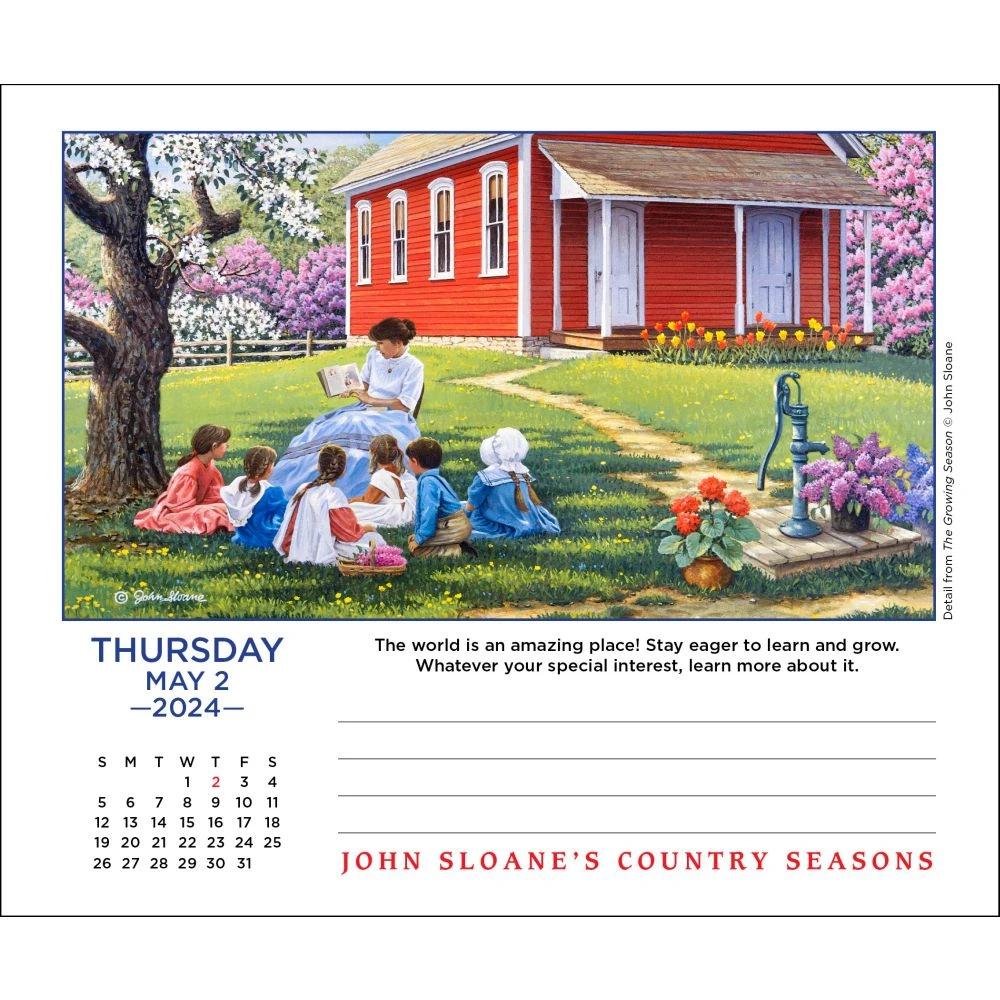 You don’t have to live in the country to love the country. Recall the simple joys of rural life and days gone by with John Sloane’s Country Seasons 2024 Desk Calendar. Each page features a detail from one of Sloane’s beautifully detailed paintings of the American countryside as well as an inspiring reflection to ponder.