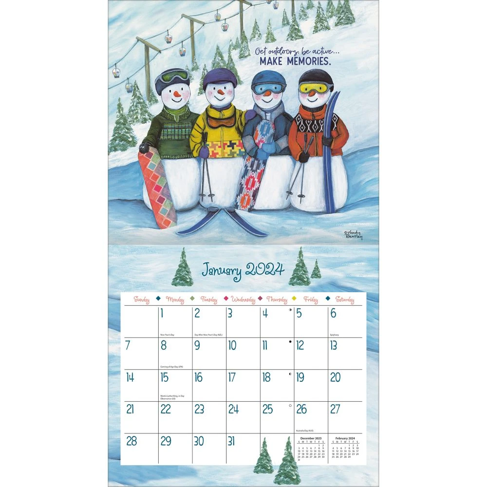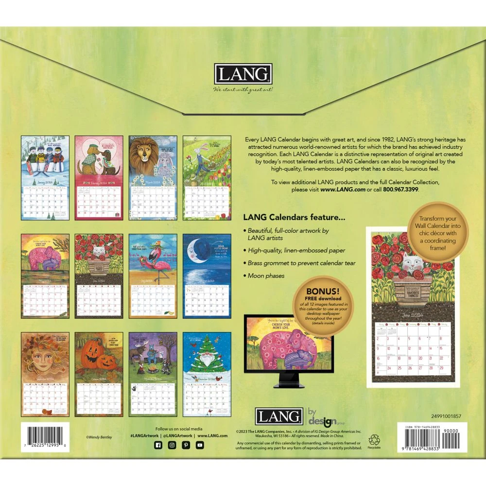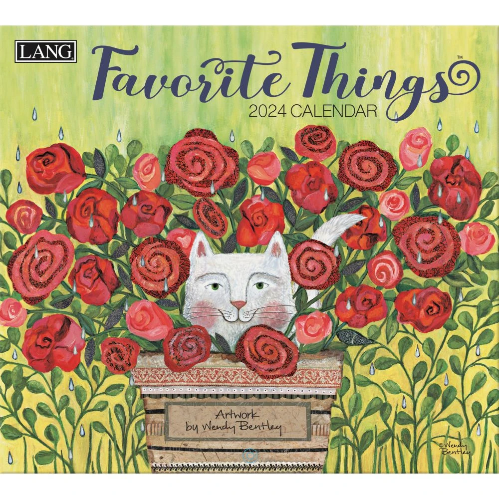 The Favorite Things 2024 Wall Calendar features stunning monthly artwork by Wendy Bentley of cherishable moments and inspirational phrases. LANG Wall Calendars feature monthly full color images, elegant linen embossed paper stock, and a brass grommet for hanging. Desktop wallpaper download available.
