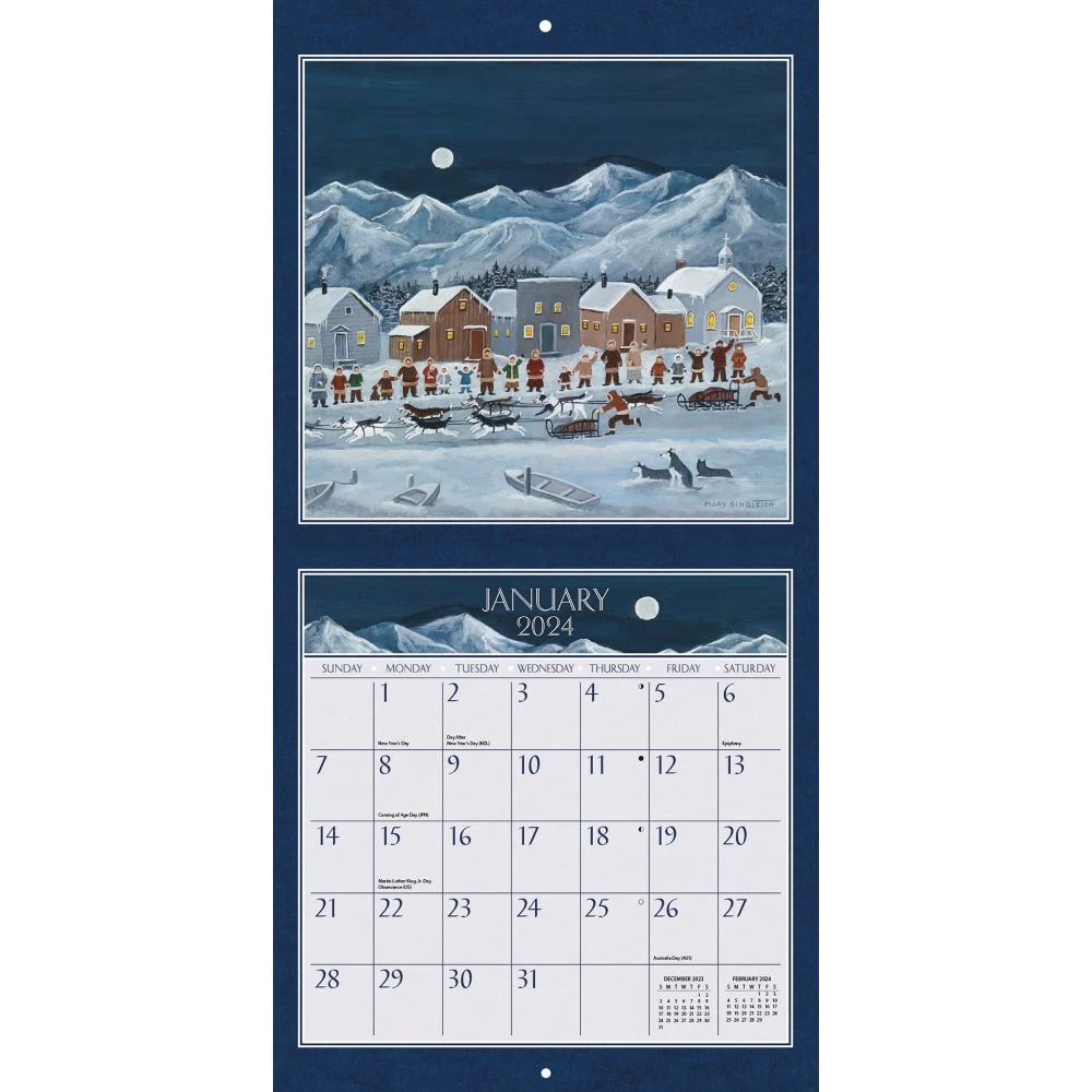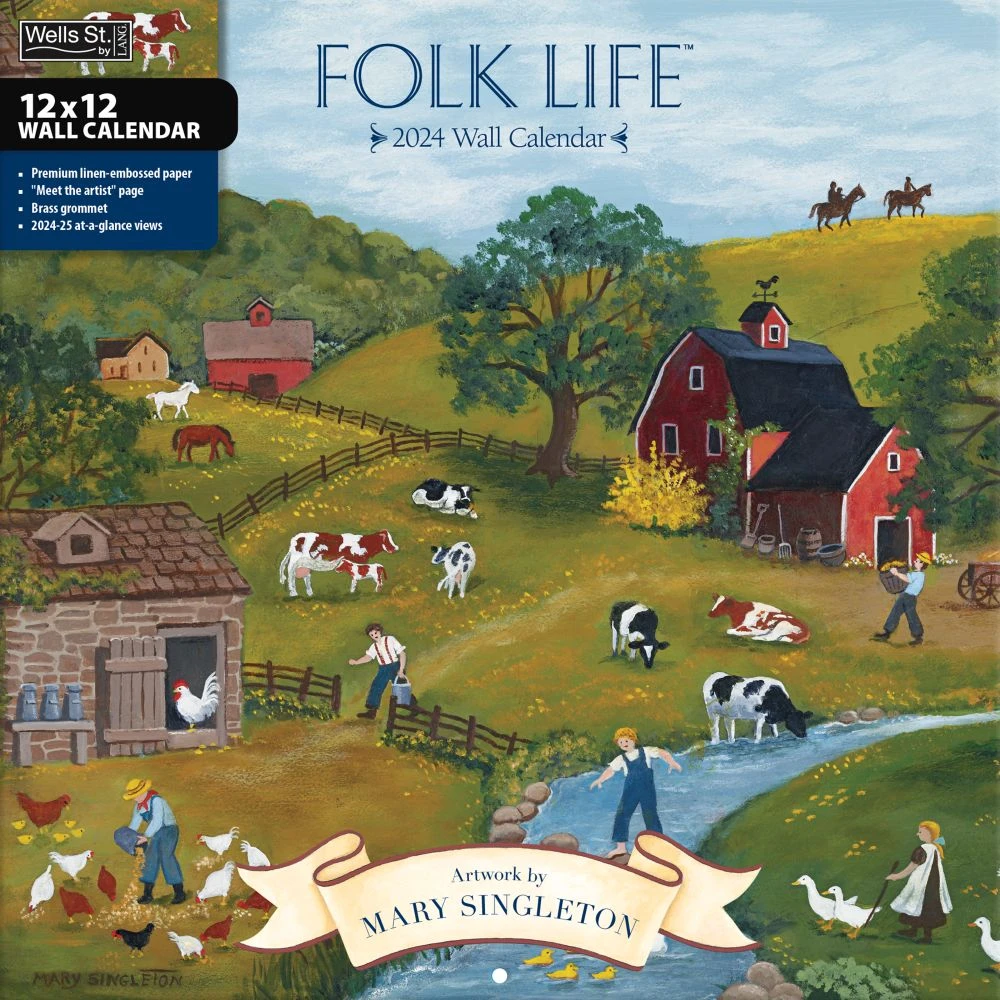 The Folk Life 2024 Wall Calendar features monthly folk art by Mary Singleton of townspeople in the rural countryside enjoying seasonal activities. Wells St. by LANG Wall Calendars feature monthly full color images based on hand painted originals, elegant linen embossed paper stock, and a brass grommet for hanging.