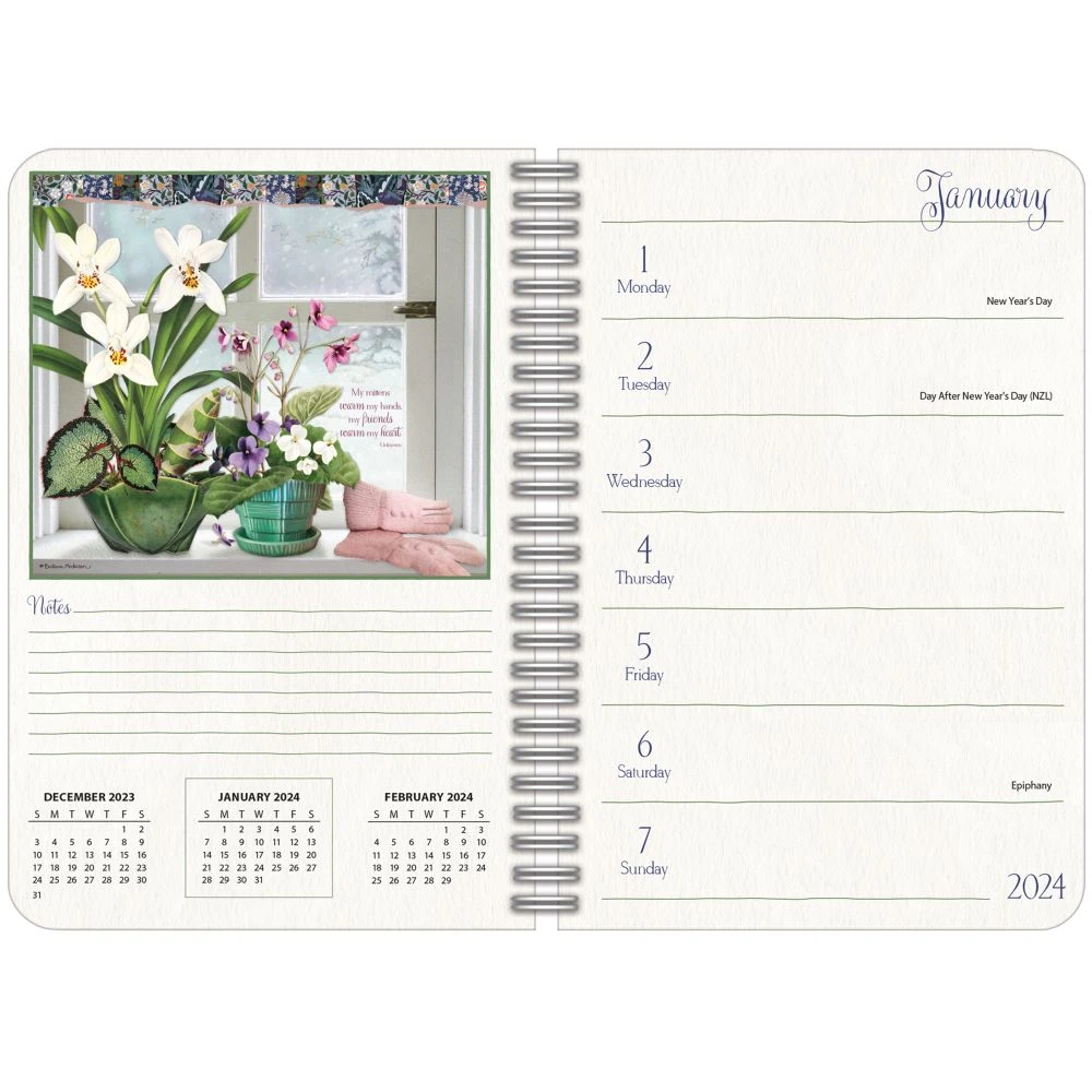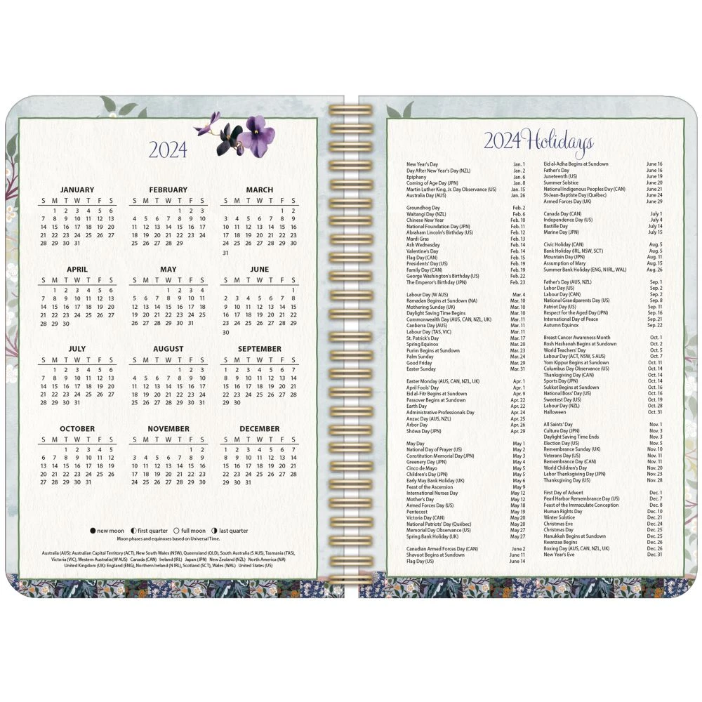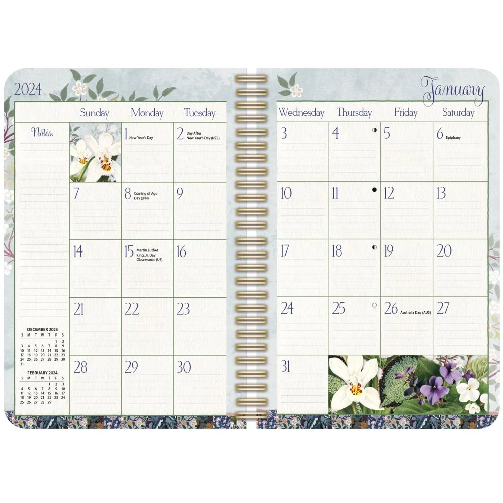 Stay organized with the Garden Botanicals 2024 Spiral Engagement Planner featuring full color artwork by Barbara Anderson. You can plan by week or by month on spacious calendar pages, in addition to taking notes and recording addresses in the pages in the back.