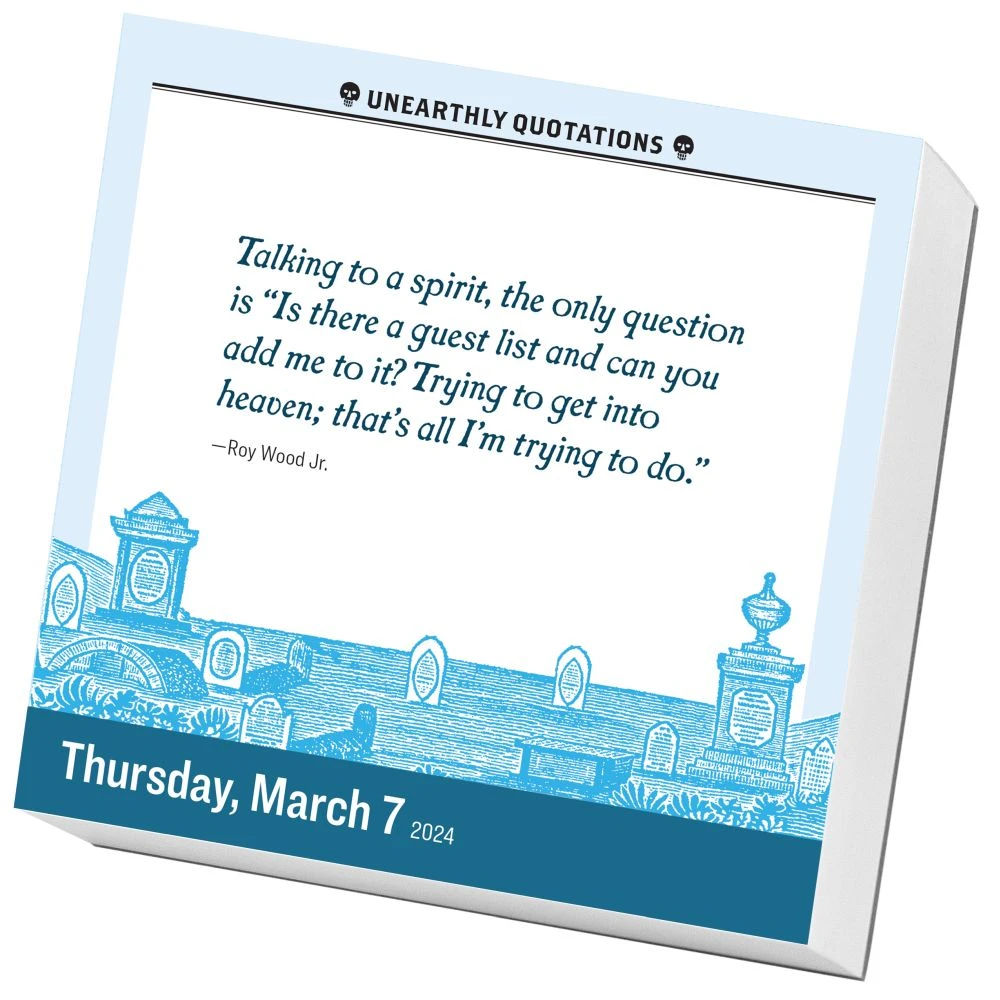 Read it and scream! A daily dose of chills and thrills. Packed with spirits, hauntings, and supernatural phenomena, this calendar will make you want to keep the lights on, all year long. Learn about ?Huggin? Molly,? who assuages her grief from losing a child by grabbing live children and screaming in their ears. The ghosts of Woodburn Mansion?the Delaware Governor?s residence?who have been known to drain wine decanters at night. More thoughtful spirits, like the ghost of an executed man who appeared before a shopkeeper not to spook him, but to pay back money he owed. Plus the terrifying Chindi of Navajo legend, phantom hitchhikers, a Ghostly Glossary of all matters macabre, and Spooky Quotes: ?The truth is that monsters are real, and ghosts are real, too. They live inside us, and sometimes they win.??Stephen King. Printed on responsibly sourced paper and 100% recyclable.