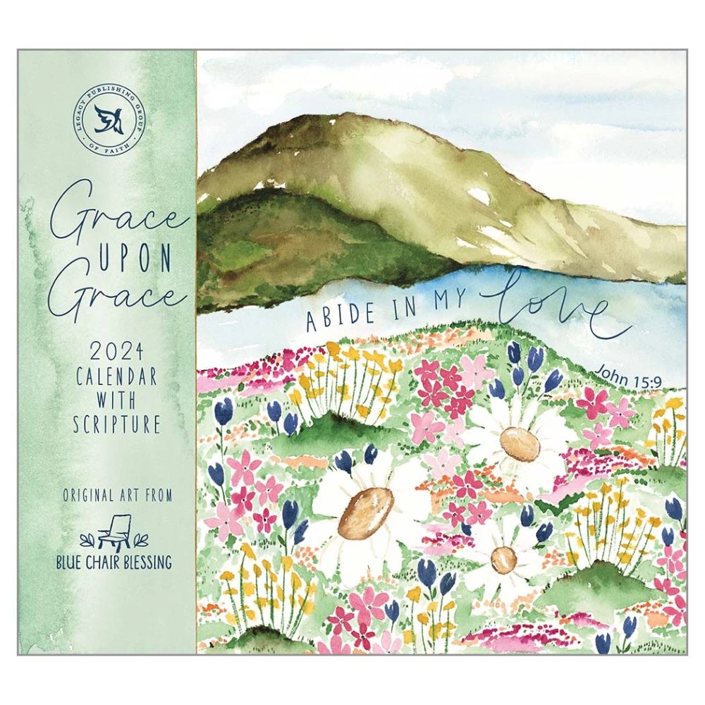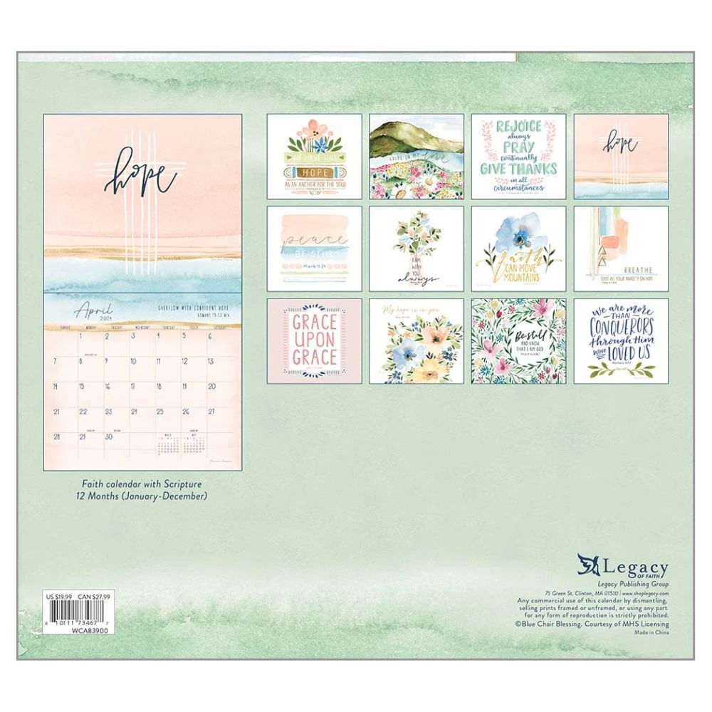 This 2024 Legacy Wall Calendar features beloved Scripture verses on the lovely and inspiring watercolor artwork of Blue Chair Blessings. Each 12 month calendar is printed on premium, linen embossed paper that has a distinctive, luxurious feel to it, and comes in a protective sleeve. The date pad is uniquely designed for each calendar title to complement the artwork. The last page contains a 2 year calendar (2023/2024) and space for notes. Brass gusset on front cover for added durability.