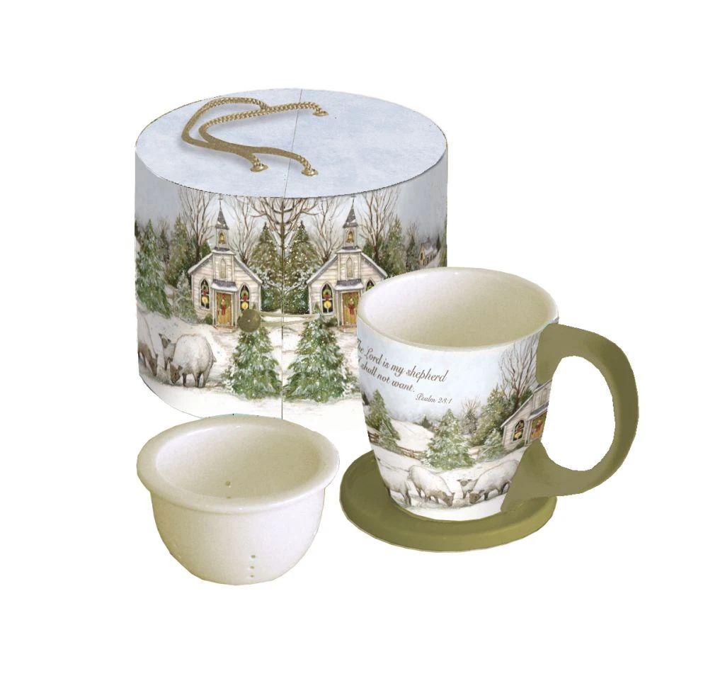 Enjoy your afternoon tea with this beautiful Grazing Morning Tea Cup Set featuring adorable sheep in a winter scene artwork by Susan Winget. The tea cup set includes tea cup, ceramic steeper and coordinating gift box. Your 3 piece ceramic tea mug set will safely arrive in a charming box with a decorative clasp closure, making it the perfect keepsake for yourself or a cherished gift for the tea lover on your list. You can even pair your new tea mugs with a wooden tea box from LANG!