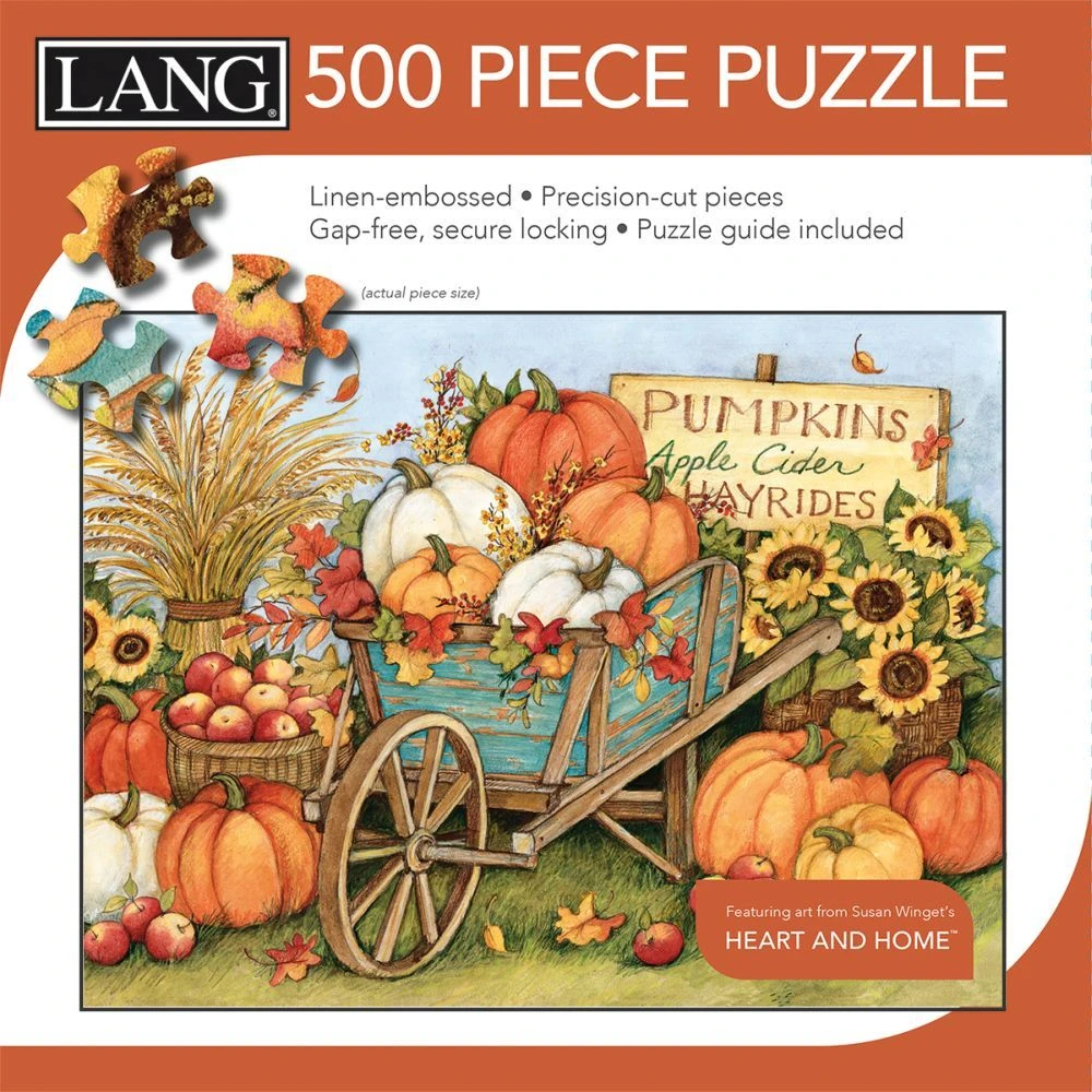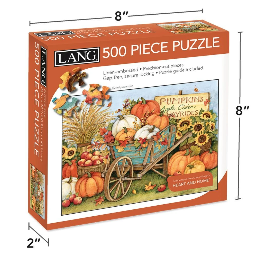 LANG puzzles are a fun and challenging activity to do with friends and family! Tackle the Harvest Wheelbarrow 500 Piece Puzzle, featuring artwork by Susan Winget. Each puzzle piece is finished with linen embossed paper so the completed piece looks like one large canvas! If you get stumped, an art guide print is included to help you out.