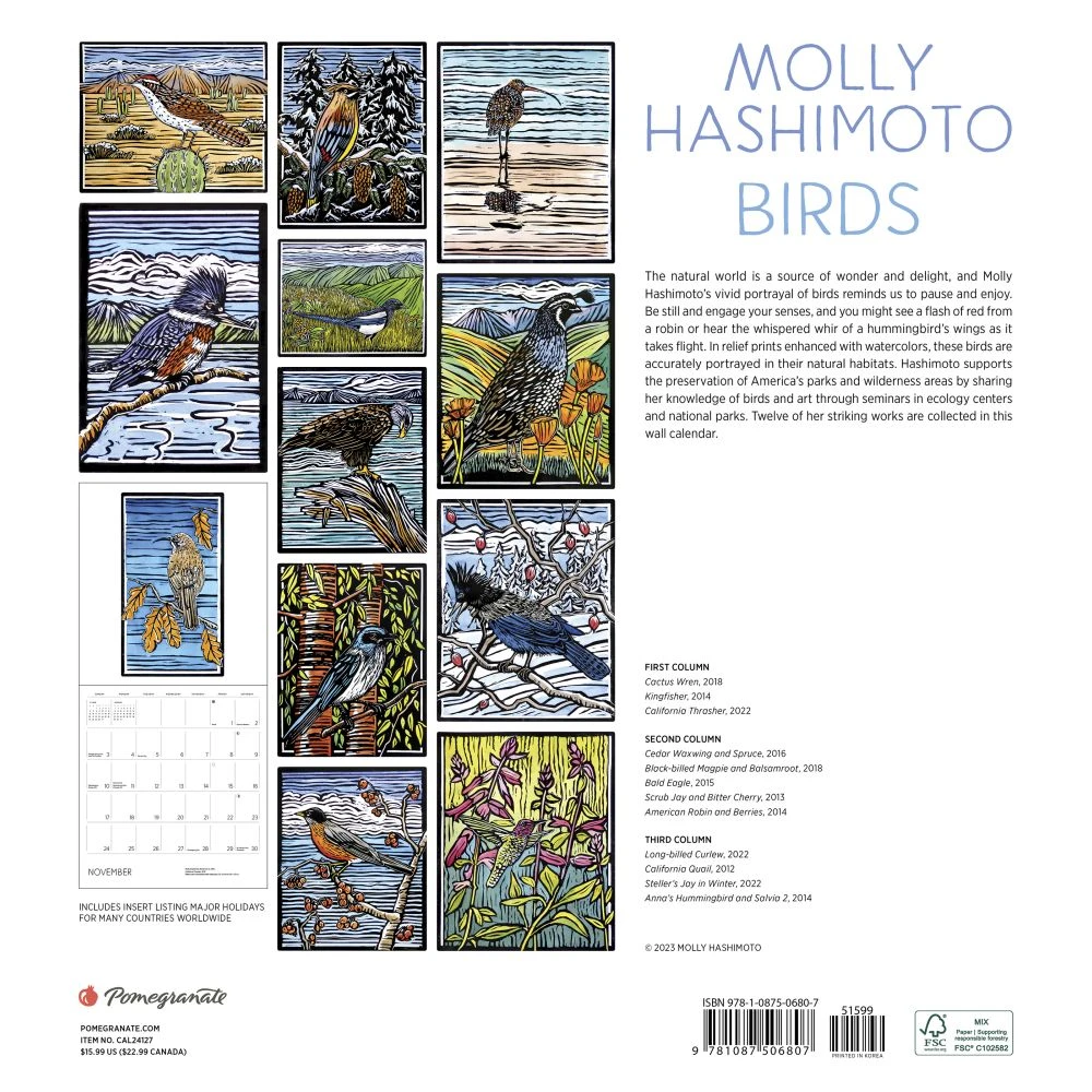 The natural world is a source of wonder and delight, and Molly Hashimoto?s vivid portrayal of birds reminds us to pause and enjoy. Be still and engage your senses, and you might see a flash of red from a robin or hear the whispered whir of a hummingbird?s wings as it takes flight. In relief prints enhanced with watercolors, these birds are accurately portrayed in their natural habitats. Hashimoto supports the preservation of America?s parks and wilderness areas by sharing her knowledge of birds and art through seminars in ecology centers and national parks. Twelve of her striking works are collected in this wall calendar.