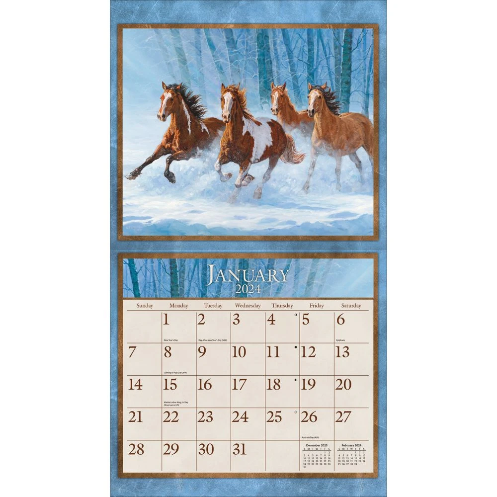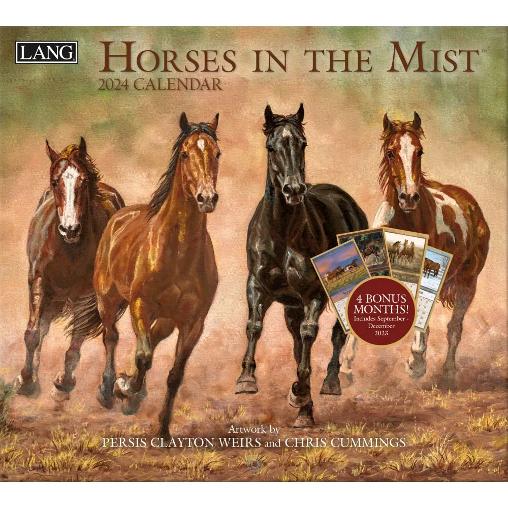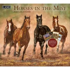 The Special Edition Horses in the Mist 2024 Wall Calendar is decorated with monthly artwork by Persis Clayton Weirs and Chris Cummings of majestic horses in the wild. LANG Wall Calendars feature monthly full color images, elegant linen embossed paper stock, and a brass grommet for hanging. Includes a 9×12 bonus print that can be framed for year round art!