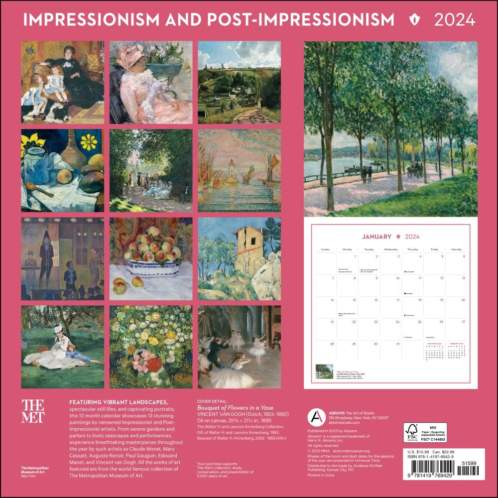 Bring a hint of Impressionist beauty into your home this year with the Impressionist Blooms 2024 Wall Calendar! Showcasing thirteen stunning masterpieces from the Metropolitan Museum of Art, each month will bring a fresh burst of color inspired by the compelling works of some of the world’s best Impressionist and Post Impressionist painters. Featuring an effortlessly chic staple binding, enjoy flipping through twelve months full of plush honeysuckles, daring poppies and delicate daisesperfect for bringing a bit of joy as you track special occasions throughout the year! Make this season beautiful with the Impressionist Blooms 2024 Wall Calendar.