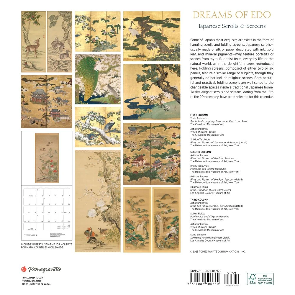 Some of Japan’s most exquisite art exists in the form of hanging scrolls and folding screens. Japanese scrolls?usually made of silk or paper decorated with ink, gold leaf, and mineral pigments?may feature portraits or scenes from myth, Buddhist texts, everyday life, or the natural world, as in the delightful images reproduced here. Folding screens, composed of either two or six panels, feature a similar range of subjects, though they generally do not include religious scenes. Both beautiful and practical, folding screens are well suited to the changeable spaces inside a traditional Japanese home. Twelve elegant scrolls and screens, dating from the 16th to the 20th century, have been selected for this calendar.