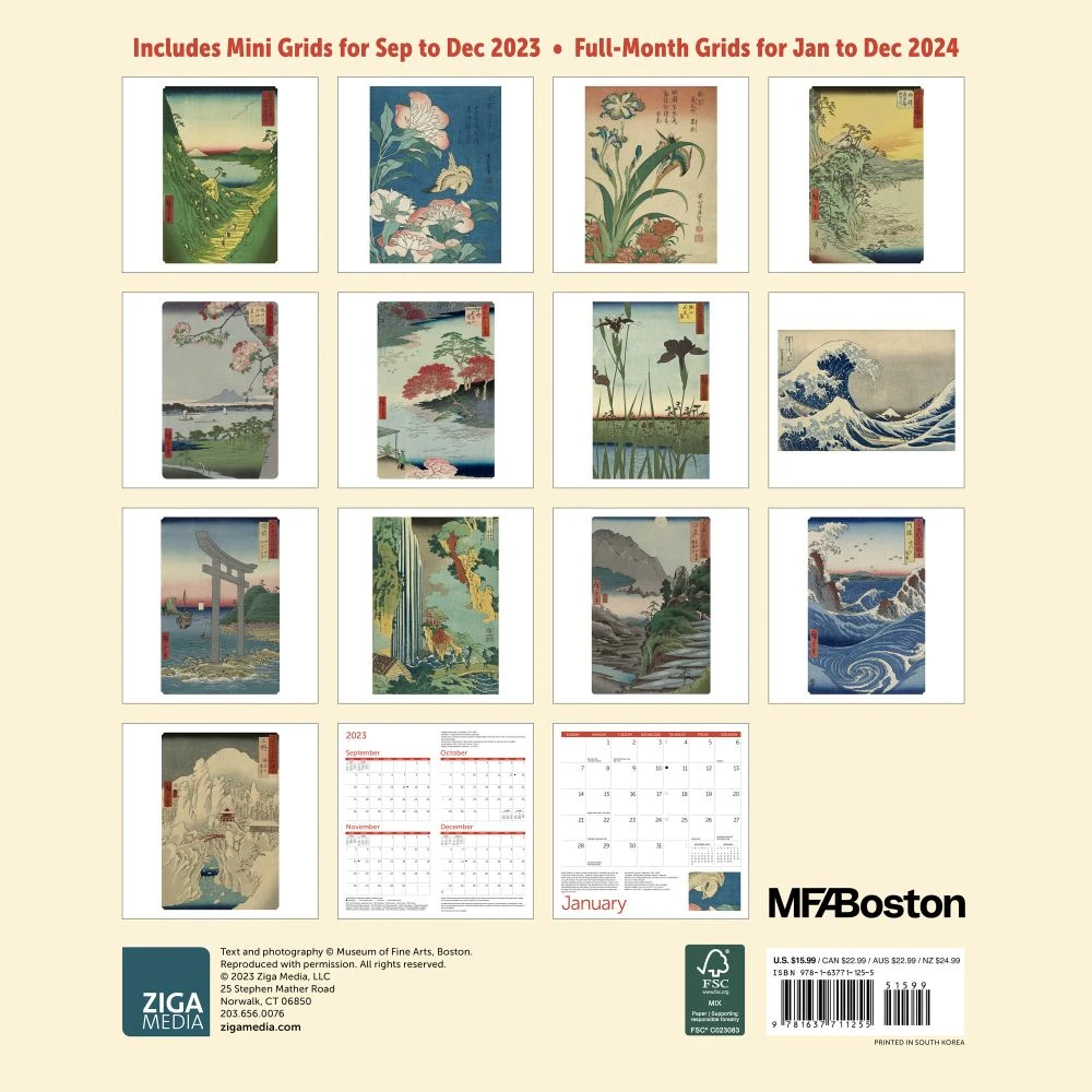 Japanese woodblock prints from Katsushika Hokusai?s and Utagawa Hiroshige?s Thirty six Views of Mount Fuji and Famous Places in the Sixty odd Provinces adorn the pages of this 2024 calendar. Reproduced in conjunction with the Museum of Fine Arts, Boston, where these masterworks are housed, each print is both historically and artistically significant. Each delicately rendered, beautifully colored print depicts a snapshot of everyday life in 19th century Japan; caption information provides full provenance for each print as well as descriptive information about each scene.