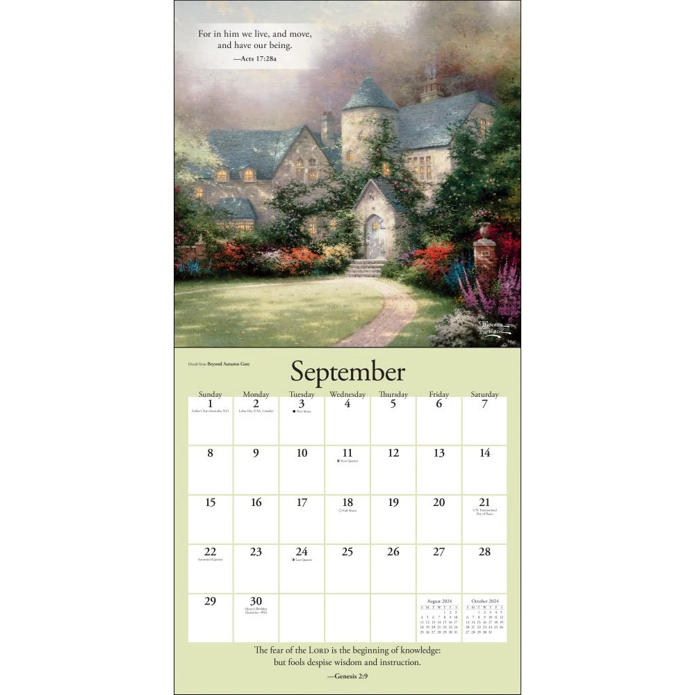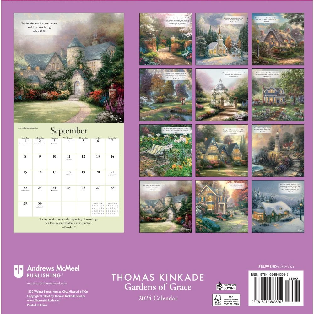 The? Thomas Kinkade?Gardens of Grace with Scripture 2024 Wall Calendar features thirteen beautiful, full color images of paintings by the Thomas Kinkade Studios accompanied by uplifting verses from the King James Bible (KJV).