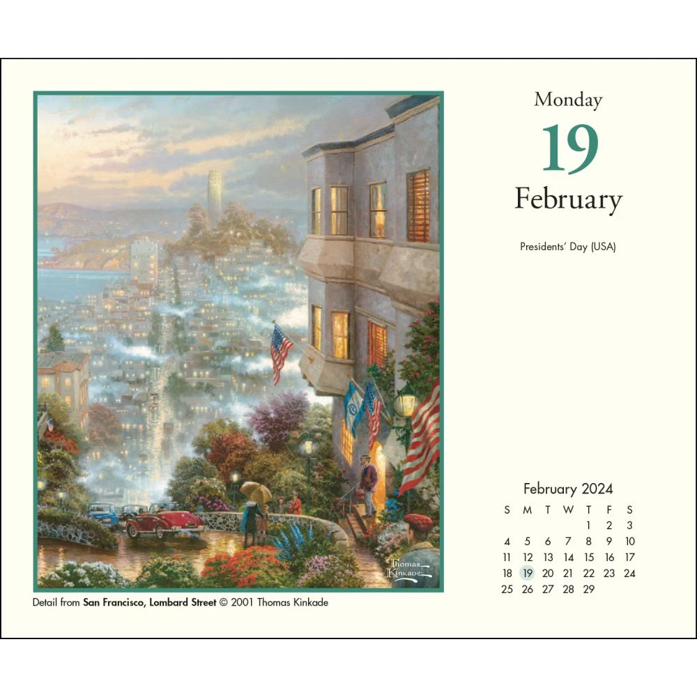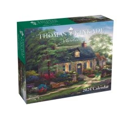 Add a touch of grace and beauty to your day with the Thomas Kinkade Studios 2024 Day to Day Calendar which includes over 300 color image details from the remarkable collection of paintings of cottages, churches, landscapes, and cities of the world. Printed on coated paper and fitted with an easel stand for desk or tabletop display, this boxed calendar makes a lovely gift or addition to your own home or workplace.
