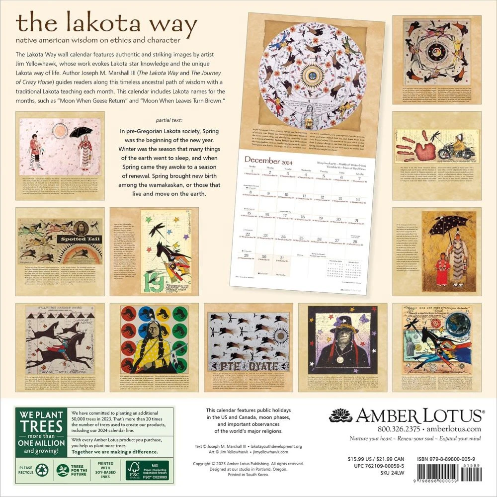 The Lakota Way wall calendar features authentic and striking images by artist Jim Yellowhawk, whose work evokes Lakota star knowledge and the unique Lakota way of life. Author Joseph M. Marshall III (The Lakota Way and The Journey of Crazy Horse) presents a traditional Lakota teaching for each month, guiding the reader along this timeless ancestral path of wisdom. The Lakota names for the months, such as ?Middle of Winter Moon? and ?Moon of Hard Times,? are included.
