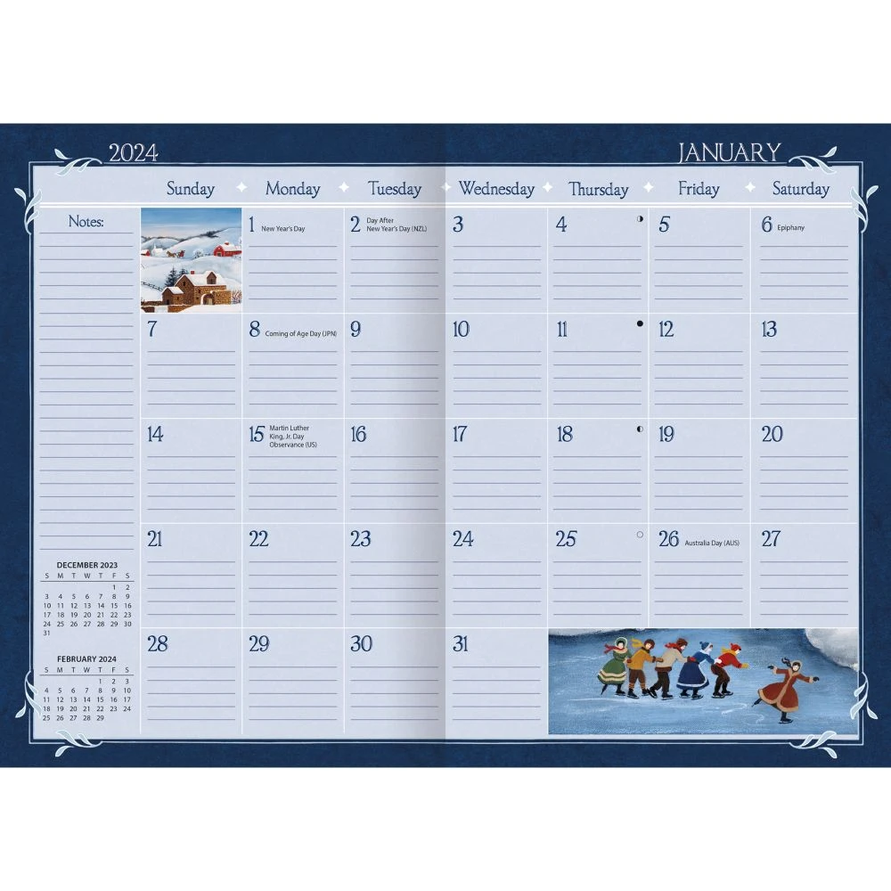 The LANG Folk Art 2024 Monthly Planner features artwork of idyllic American scenes by Mary Singleton in a 13 month calendar format with ample room for notes and engagements. LANG Monthly Planners also feature a 2024 Planning Guide and linen embossed paper cover and pocket sleeve.