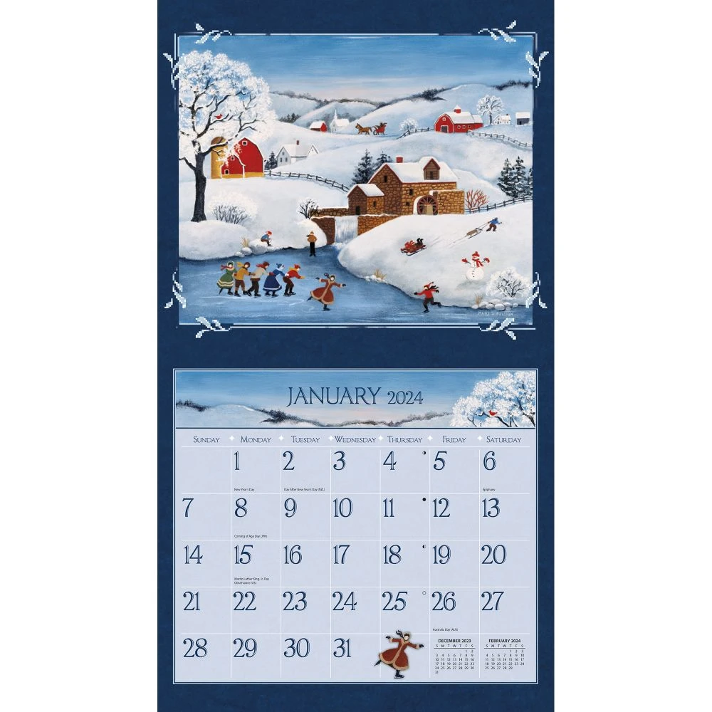 The Special Edition LANG Folk Art 2024 Wall Calendar is decorated with monthly folk art by Mary Singleton of townspeople in The Special Edition rural countryside enjoying seasonal activities. LANG Wall Calendars feature monthly full color images, elegant linen embossed paper stock, and a brass grommet for hanging. Includes a 9×12 bonus print that can be framed for year round art!