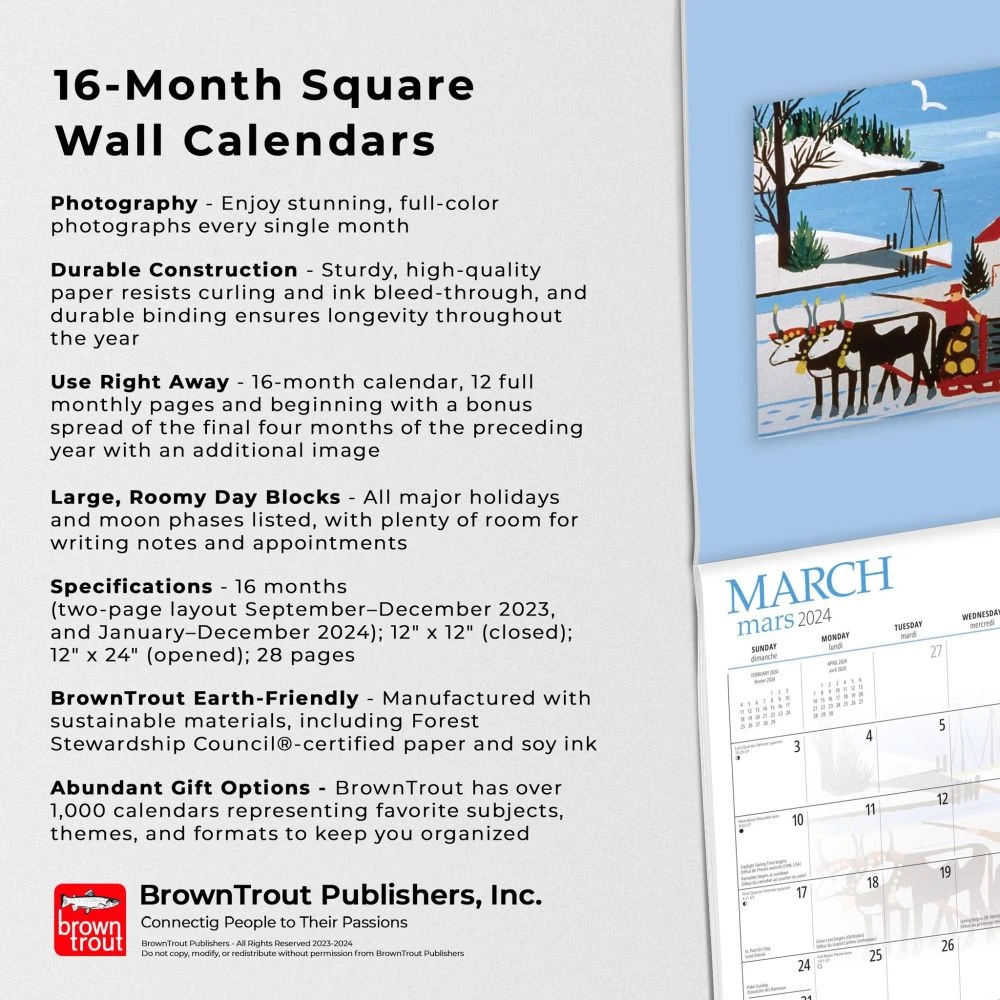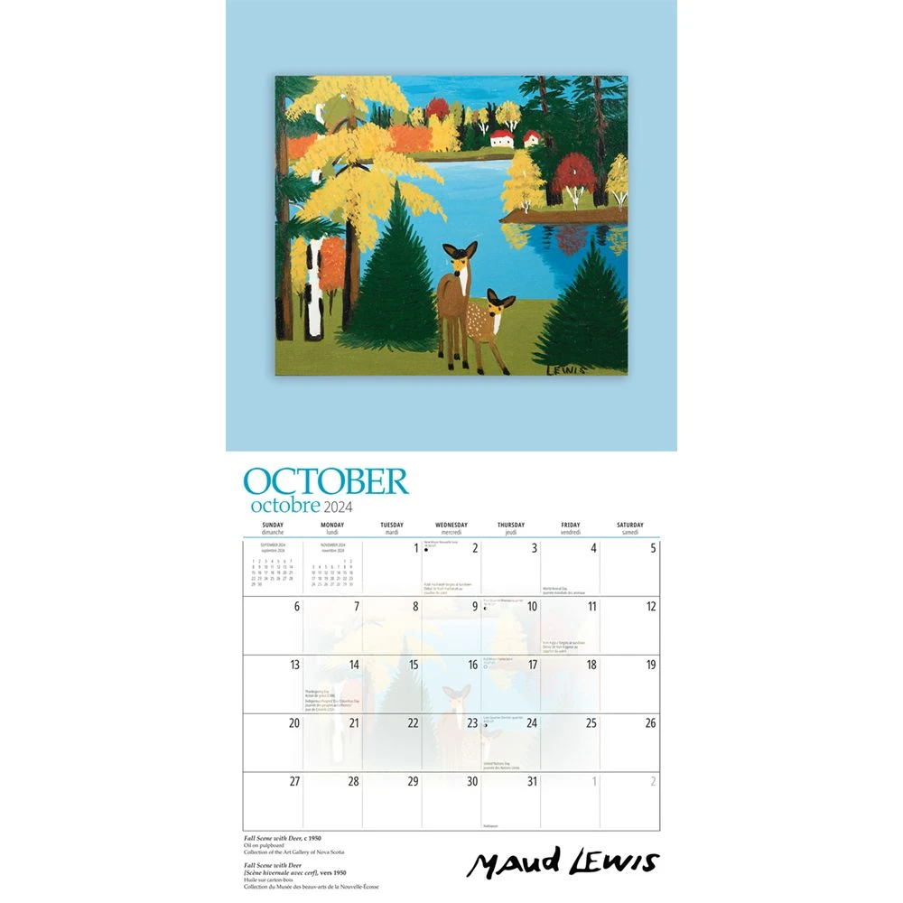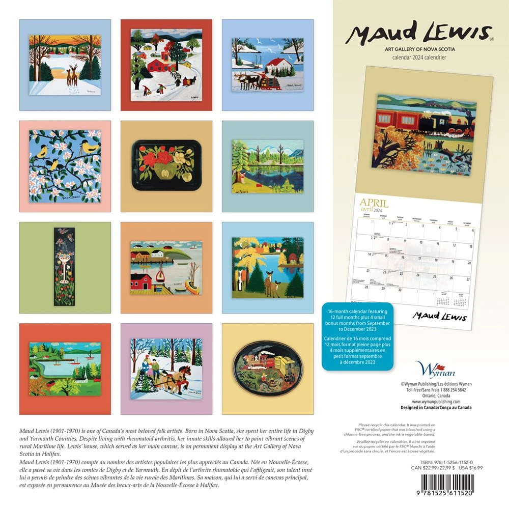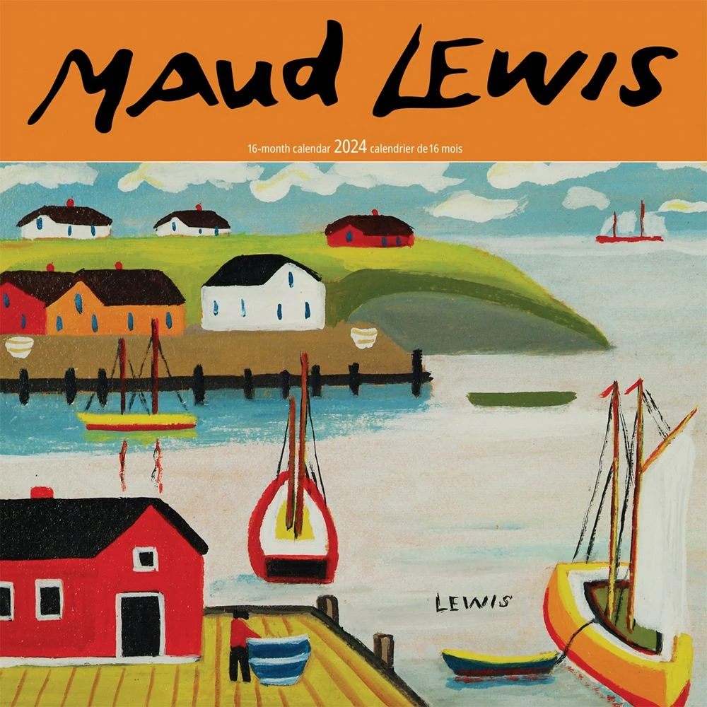 Maud Lewis (1903 – 1970) had no formal training in the visual arts. Like many folk artists, she painted for the joy of adding colour, light and fun to a poverty-stricken rural existence in Digby County, Nova Scotia. This square wall calendar is bilingual (English, French).