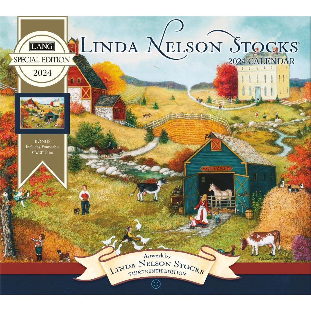 The Special Edition Linda Nelson Stocks 2024 Wall Calendar is decorated with her detailed artwork depicting rural communities through each season. LANG Wall Calendars feature monthly full color images, elegant linen embossed paper stock, and a brass grommet for hanging. Includes a 9×12 bonus print that can be framed for year round art!