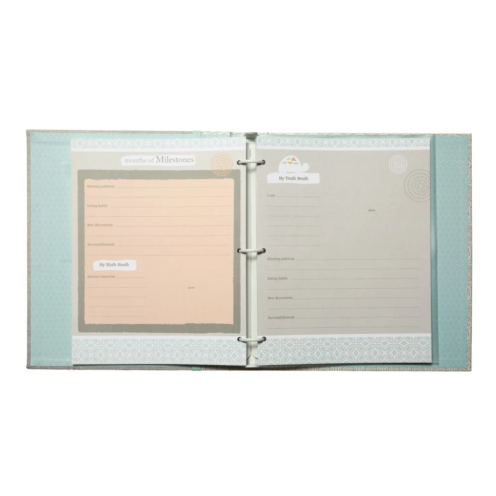 64 page albums for recording baby’s first 5 year memories and milestones. Includes 8 additional blank pages and 3 clear pocket pages. Measures 10.125″ x 11.5″ Expandable loose leaf format. Acid free, lignin free. Gift Boxed