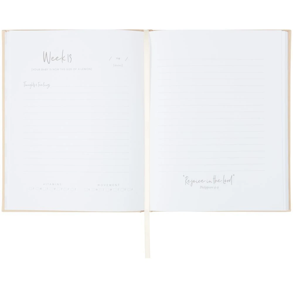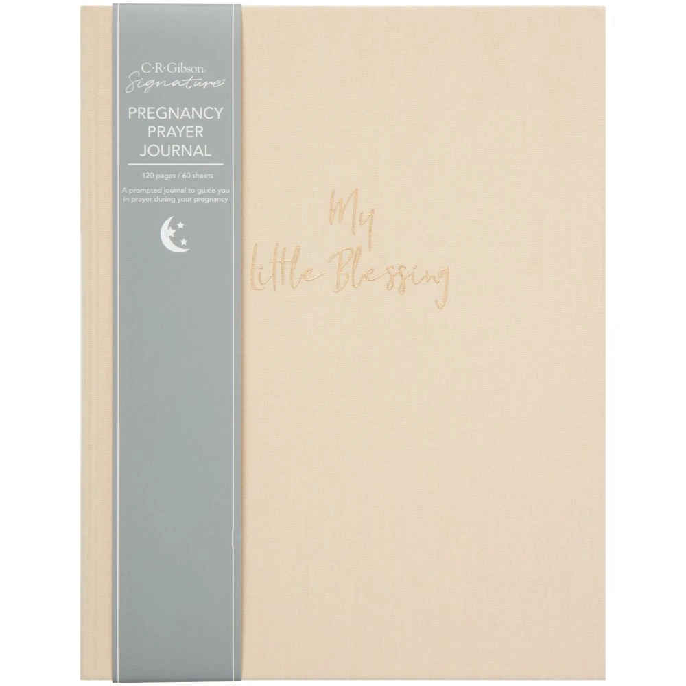 Soft greige bookcloth prayer journal with foil cover embellishement features 120 pages of guided content for Mom’s to track their preganancy prayer journey. Artist Keri Steckler