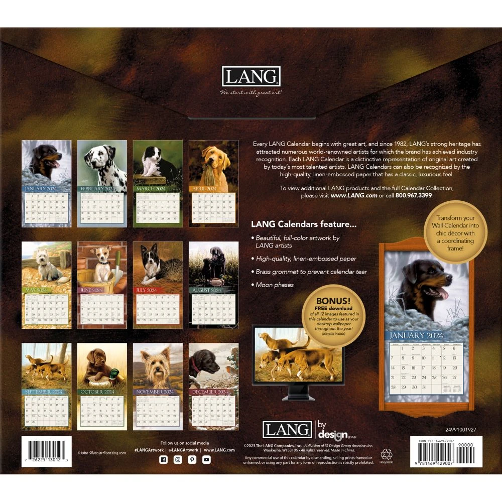 The Love of Dogs 2024 Wall Calendar is decorated with monthly artwork of lovable dogs by John Silver. LANG Wall Calendars feature monthly full color images, elegant linen embossed paper stock, and a brass grommet for hanging. Desktop wallpaper download available.