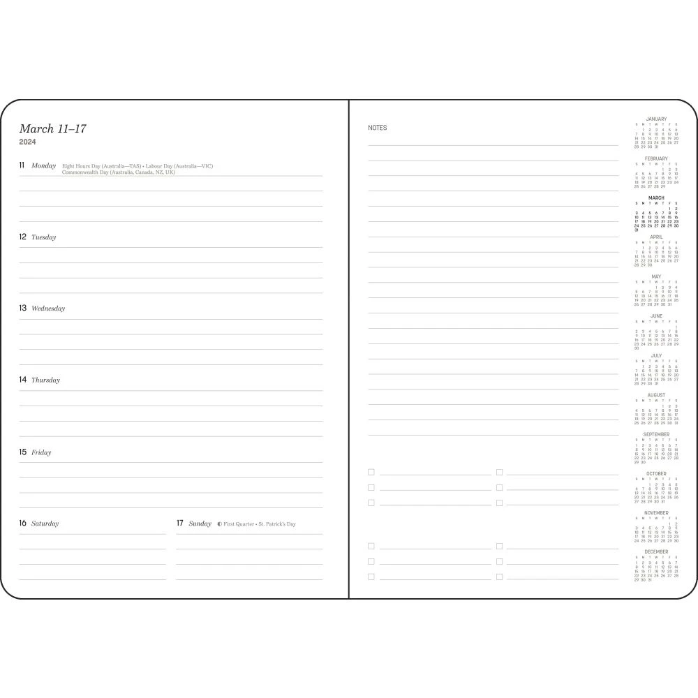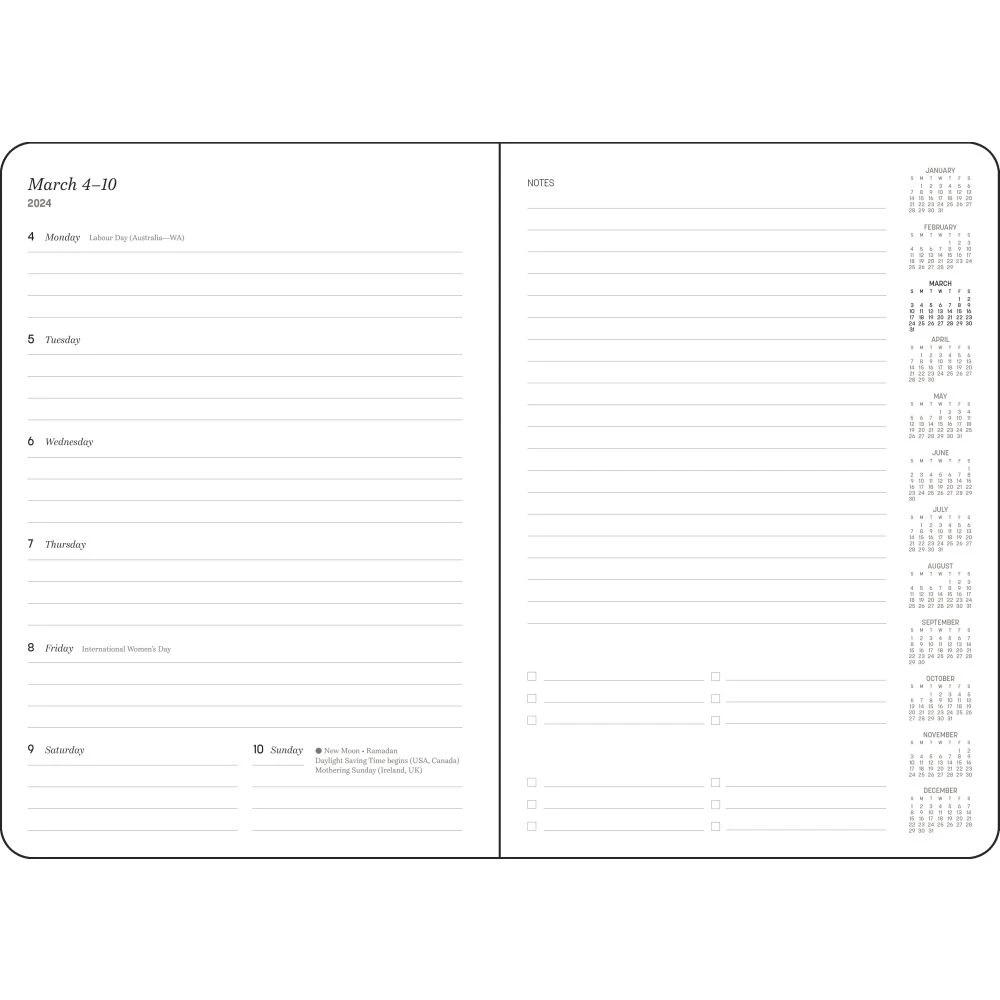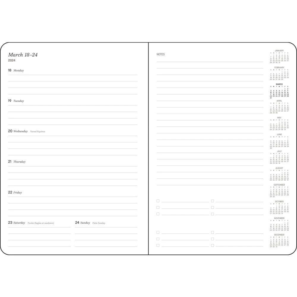 The weekly spreads ensure a detailed view of your schedule and tasks for each day, while the monthly mood/habit tracker allows you to monitor your well-being and progress towards personal goals. To enhance usability, the calendar lays flat when open, and a ribbon page marker helps you keep track of the current date.