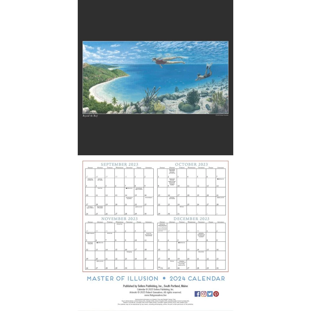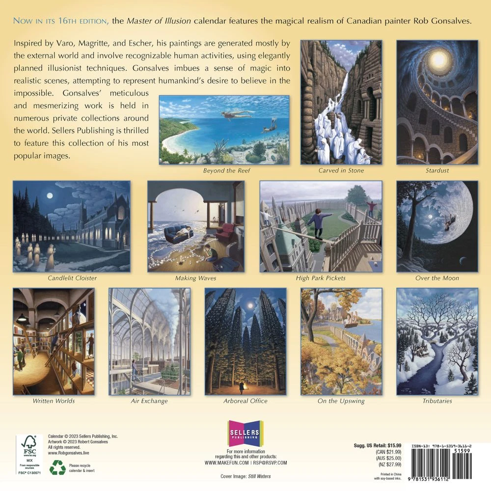 The Master of Illusion wall calendar features the magic realism of Canadian painter Rob Gonsalves. His paintings are generated mostly by the external world and involve recognizable human activities, using elegantly planned illusionist techniques. Gonsalves imbues a sense of magic into realistic scenes, attempting to represent humankinds desire to believe in the impossible. Gonsalves meticulous and mesmerizing work is held in numerous private collections around the world.