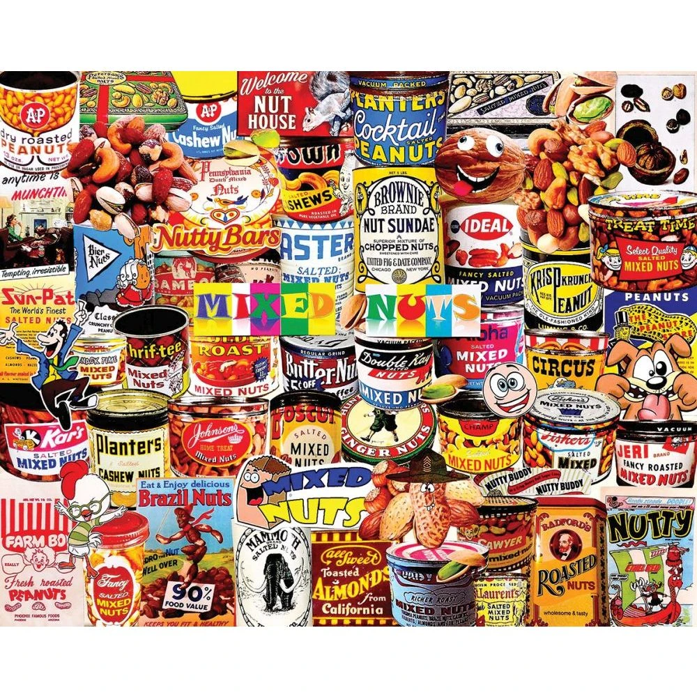 Mixed Nuts 1000 Piece Puzzle This 1000 piece jigsaw puzzle contains thick interlocking pieces made from recycled premium blue chipboard that give a sturdy feel & easy grip. Made in USA. Finished size 24?x30?.