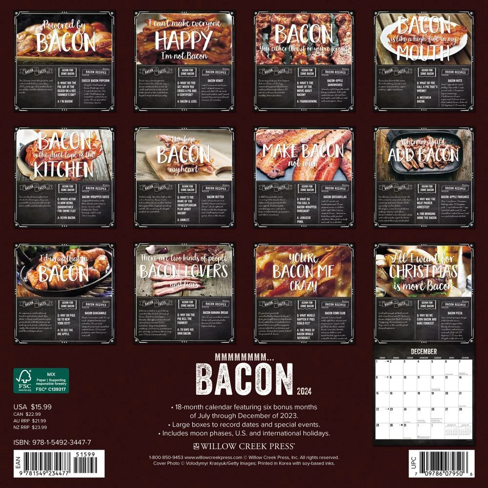 The ultimate wall calendar for the ultimate bacon fan! Make 2024 sizzle with this fun calendar filled with recipes, fun facts, trivia, tidbits and more. This makes a fun and practical gift for any bacon fan.?Printed with soy based inks on FSC certified paper, this 12″ x 24″ wall calendar features large monthly grids that offer ample room for jotting notes, along with six bonus months of July through December of 2023. Also includes moon phases (CST), standard U.S. and international holidays.