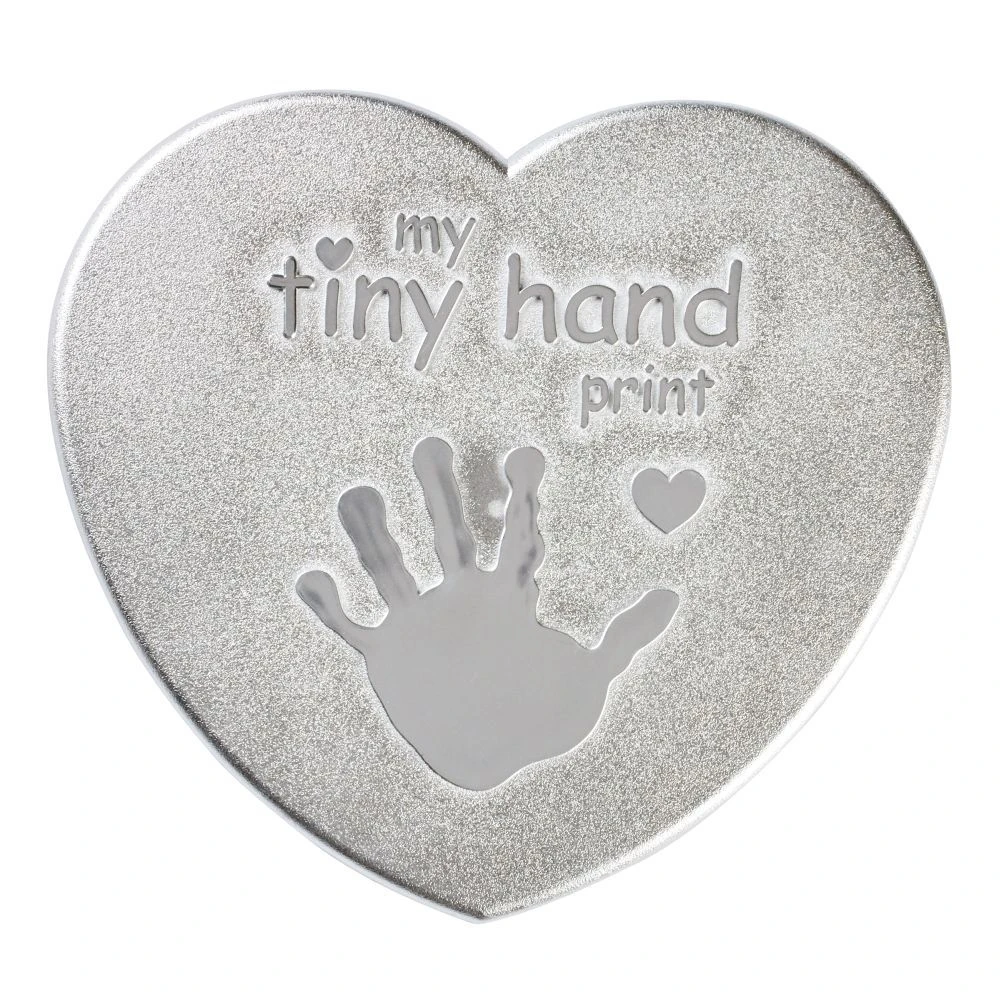 Kit includes everything you need to make a plaster cast of baby’s hand or foot print. 1 plastic mold, 1 bag of plaster (6oz net), 1 easel. Kit pieces packaged in plastic heart with embossed silver finish. Heart packaging measures 6 1/2″ x 6″ x 1 1/4″