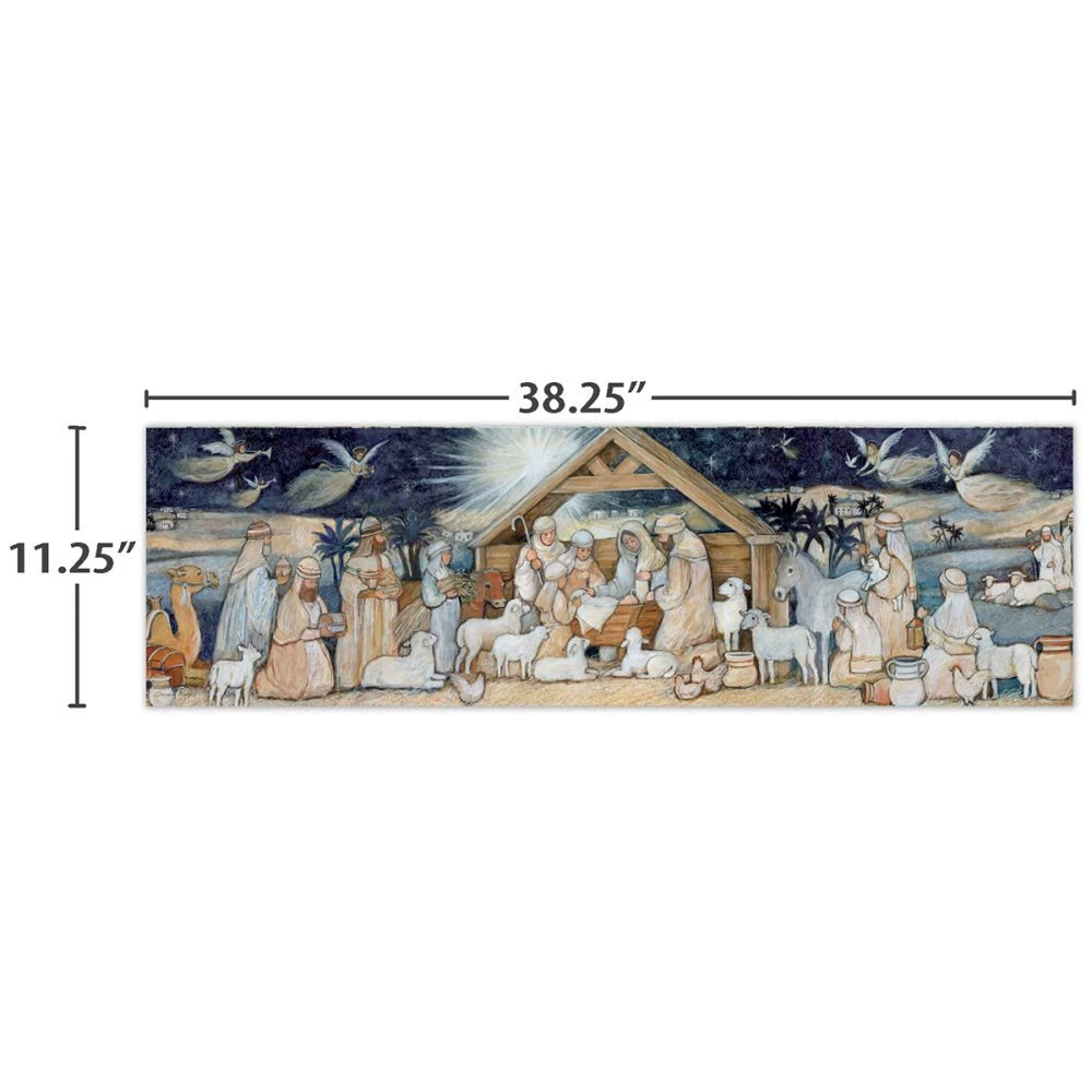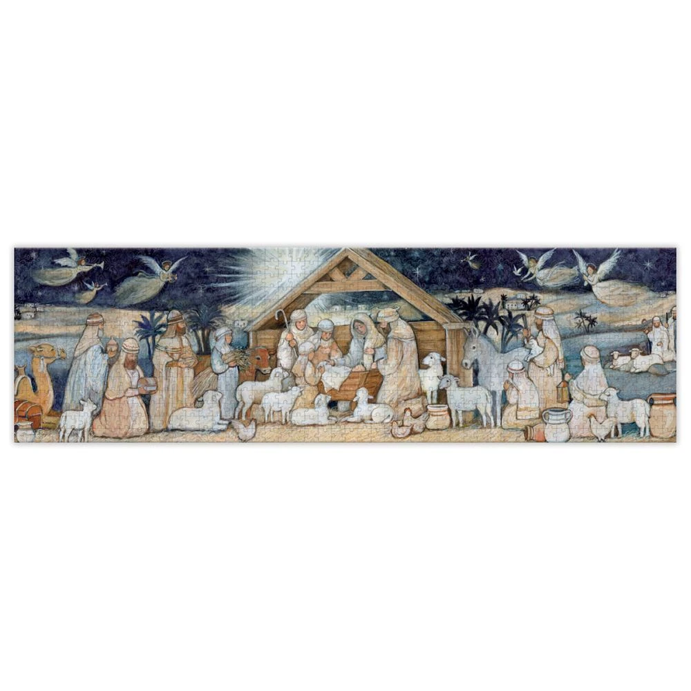 The panoramic view of the Nativity Set 750 Piece Puzzle perfectly frames this painting by Susan Winget that captures and celebrates the birth of Christ. With precision cut pieces and art print for visual reference, the Nativity Set Jigsaw Puzzle is a fun activity to do when the weather is cold or makes a great holiday gift! The art print guide makes an easy visual reference as well!