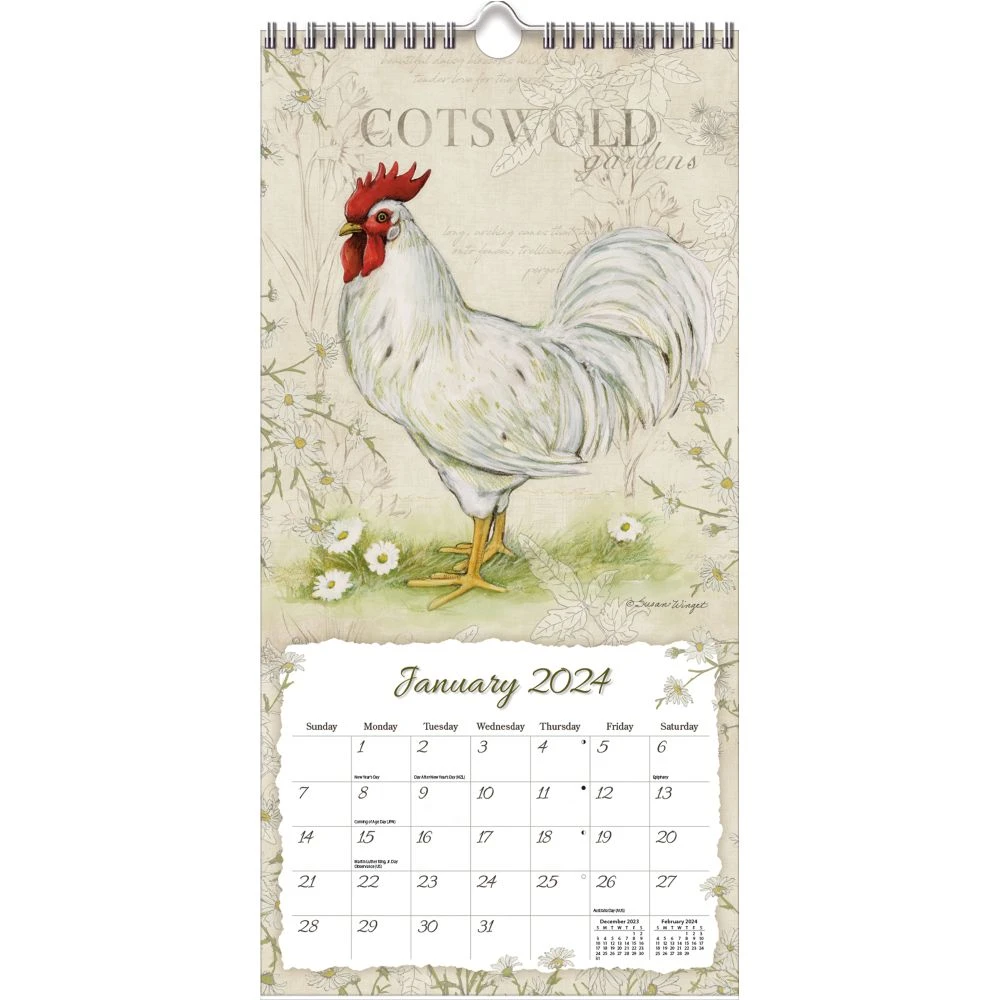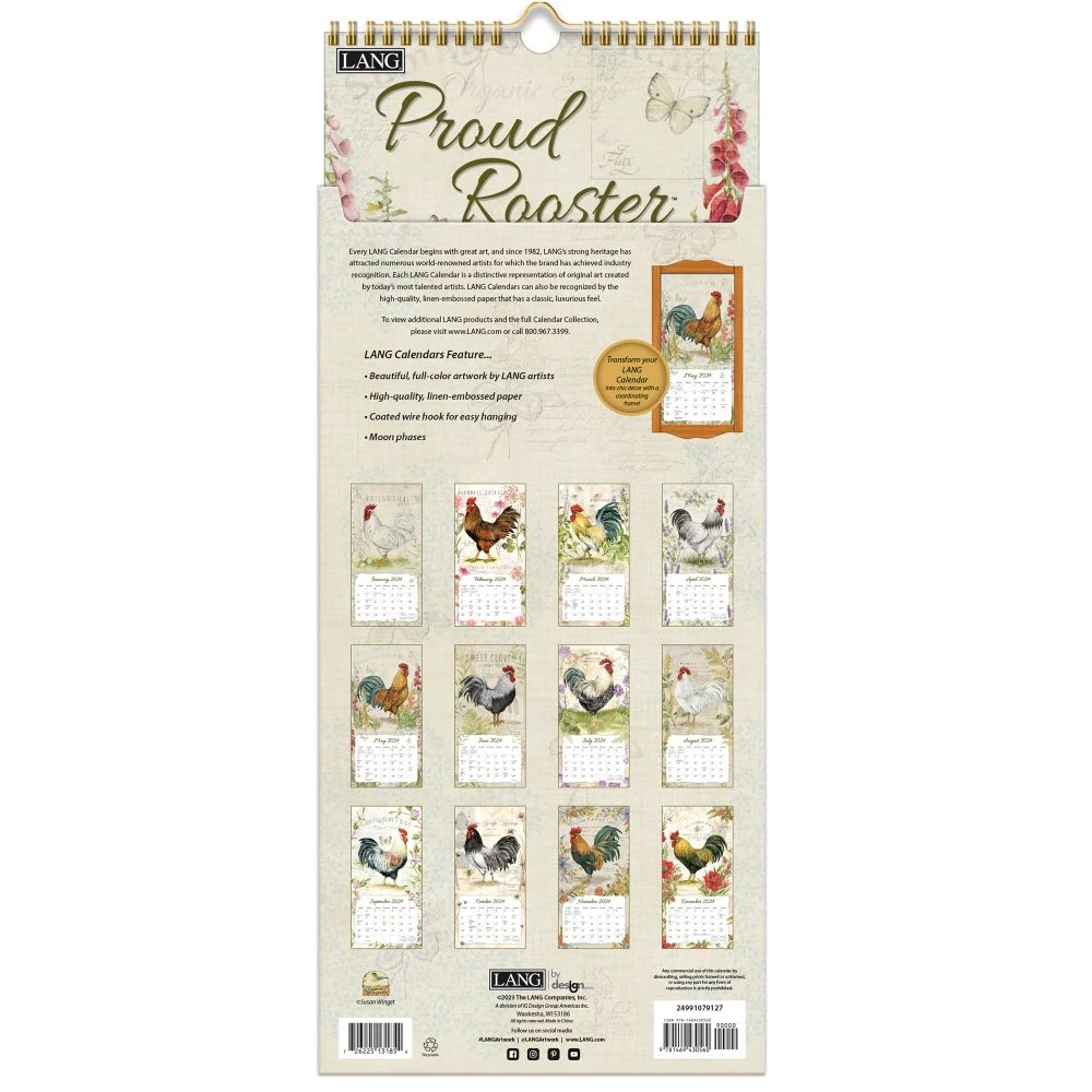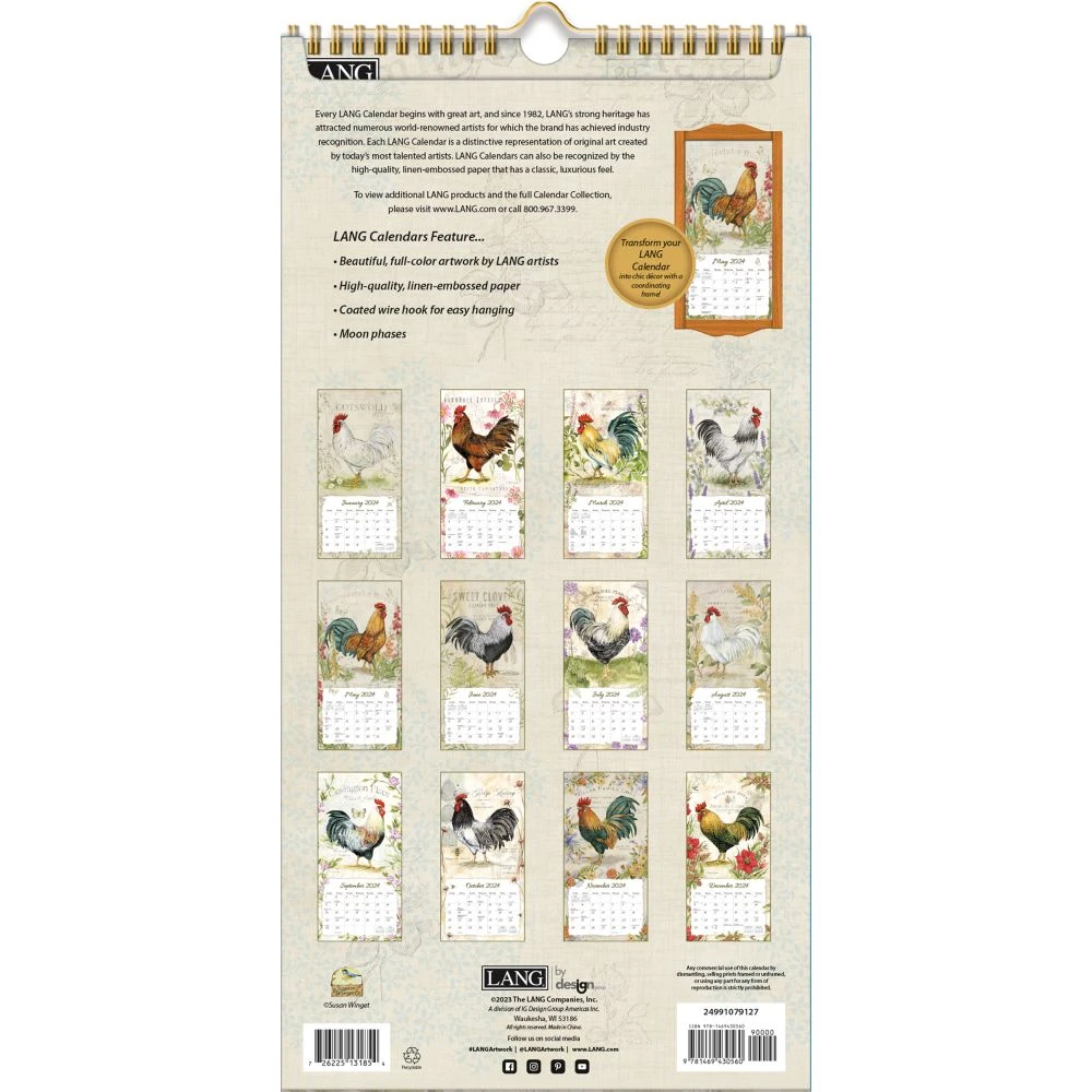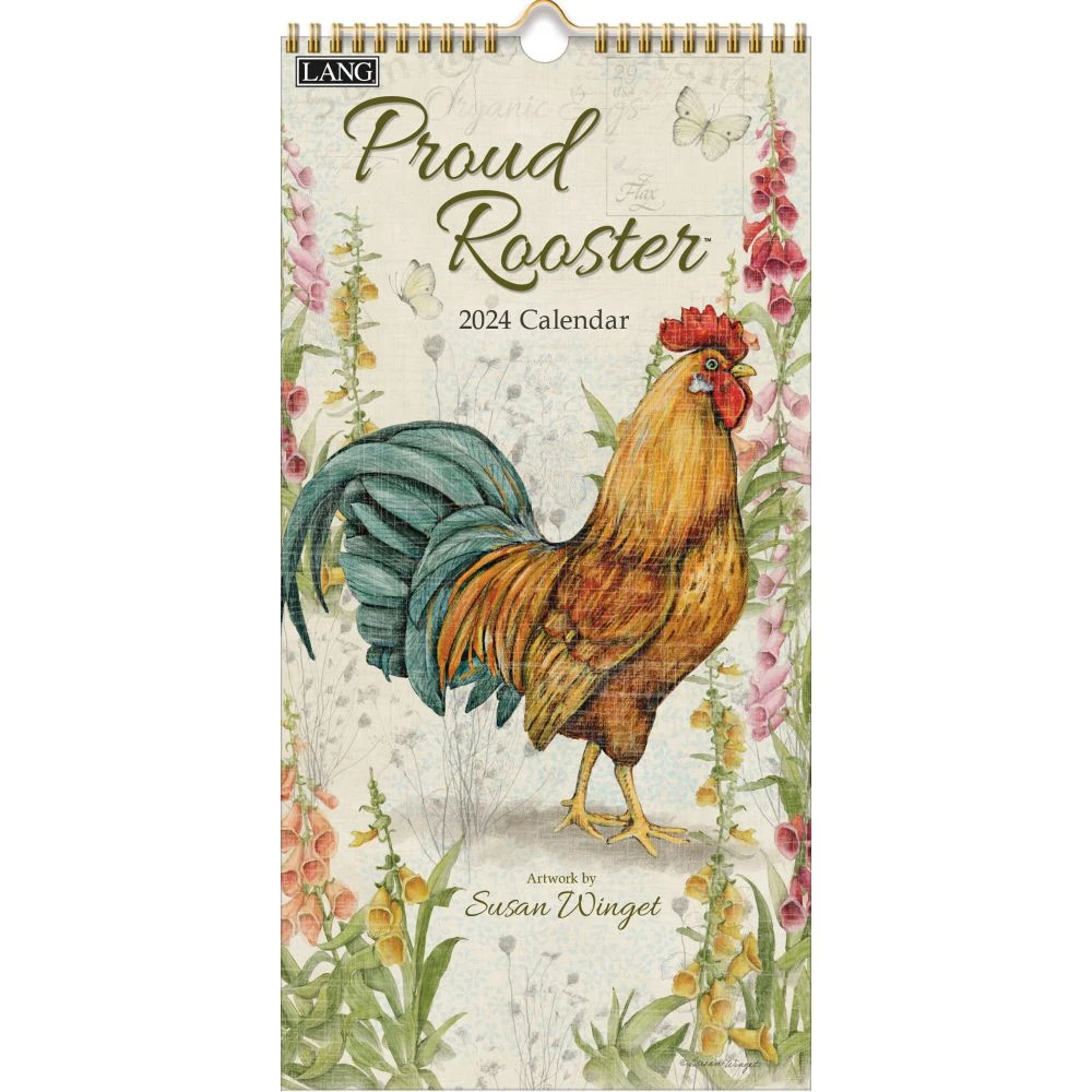 The Proud Rooster 2024 Vertical Wall Calendar features monthly artwork of handsome roosters by Susan Winget in a space efficient vertical format. LANG Vertical Wall Calendars feature linen embossed paper stock, a spiral binding with hook for hanging, and matching gift jacket.