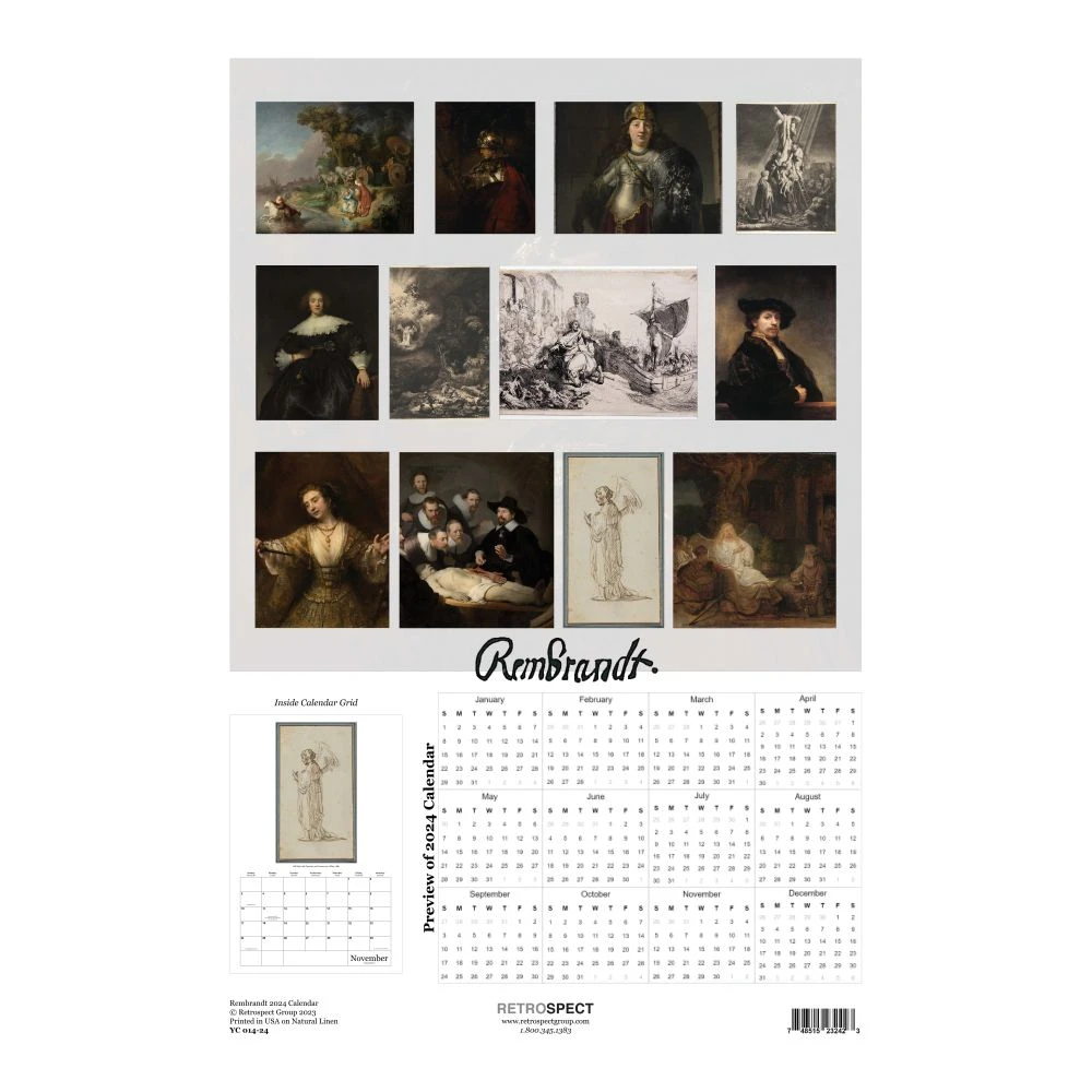 The Rembrandt Calendar captures the essence of a wide variety of Rembrandt�s work. You are sure to enjoy this calendar full of artwork created by this baroque painter and talented illustrator. These oversized wall calendars are presented on 100% fine natural linen paper. With a subtle weave pattern, this ivory colored natural paper has a very slight raised texture on the front and a smooth feel on the back. The calendar grid offers ample space for personal notations and displays major US holidays. Each calendar is spiral bound and the pages are suitable for framing at year�s end. Perfect for home or office, our calendars are produced in the USA using environmentally friendly processes and printed on FSC certified and recycled paper.