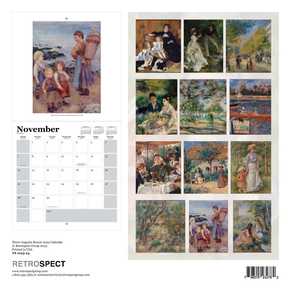 The Pierre Auguste Renoir Calendar captures the essence of a wide variety of Renoirs work. You are sure to enjoy this calendar full of artwork created by an artist who was a leading painter in the Impressionist movement. These oversized wall calendars are presented on 100% fine natural linen paper. With a subtle weave pattern, this ivory colored natural paper has a very slight raised texture on the front and a smooth feel on the back. The calendar grid offers ample space for personal notations and displays major US holidays. Each calendar is spiral bound and the pages are suitable for framing at years end. Perfect for home or office, our calendars are produced in the USA using environmentally friendly processes and printed on FSC certified and recycled paper.