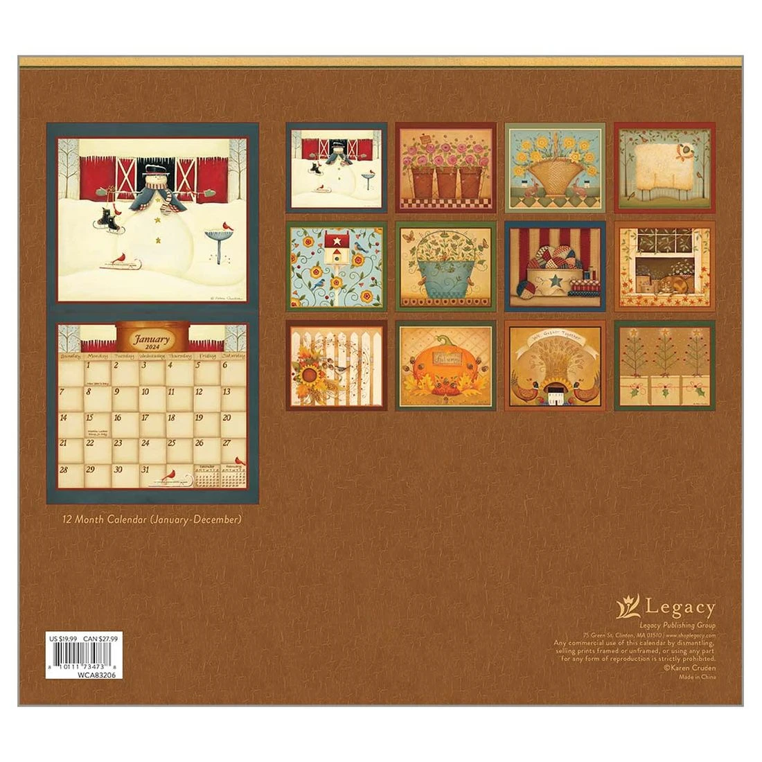 This 2024 Legacy Wall Calendar features the primitive Shaker style artwork of Karen Cruden. Each 12 month calendar is printed on premium, linen embossed paper that has a distinctive, luxurious feel to it, and comes in a protective sleeve. The date pad is uniquely designed for each calendar title to complement the artwork. The last page contains a 2 year calendar (2023/2024) and space for notes. Brass gusset on front cover for added durability.